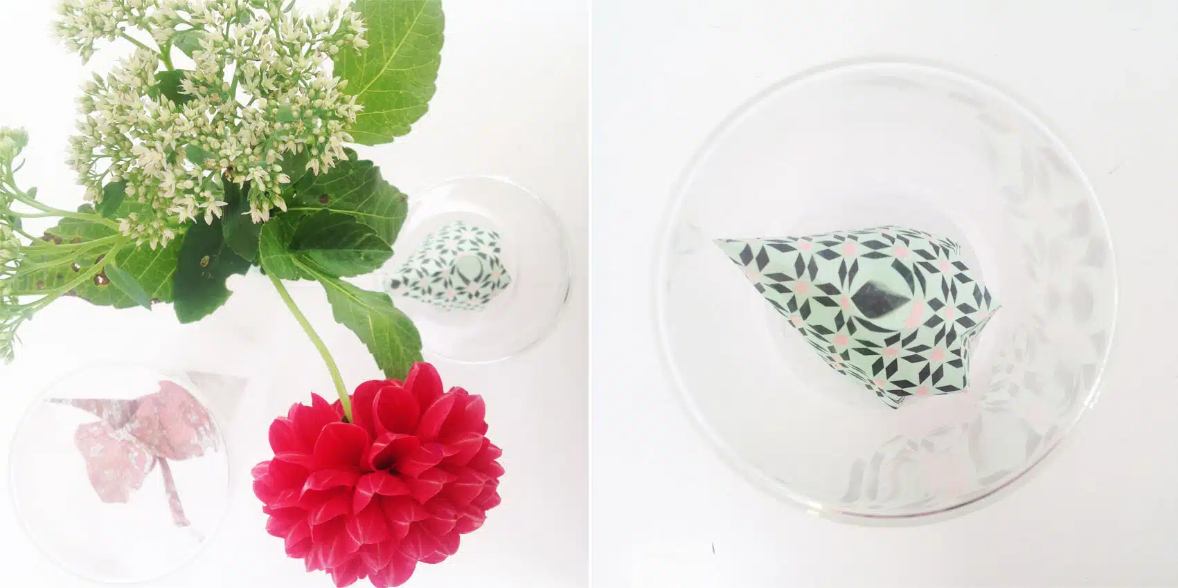 Ik schilderde de kurken deksels wit en zocht wat voorwerpen. Herinner je je de blog over de Kristalmal van de Krantenkapper nog? Ook gebruikte ik een keramieken veertje van Rie Elise Larsen en een gevouwen kraanvogel die met zijn vleugels tegen het glas aan komt en daardoor mooi lijkt te zweven.