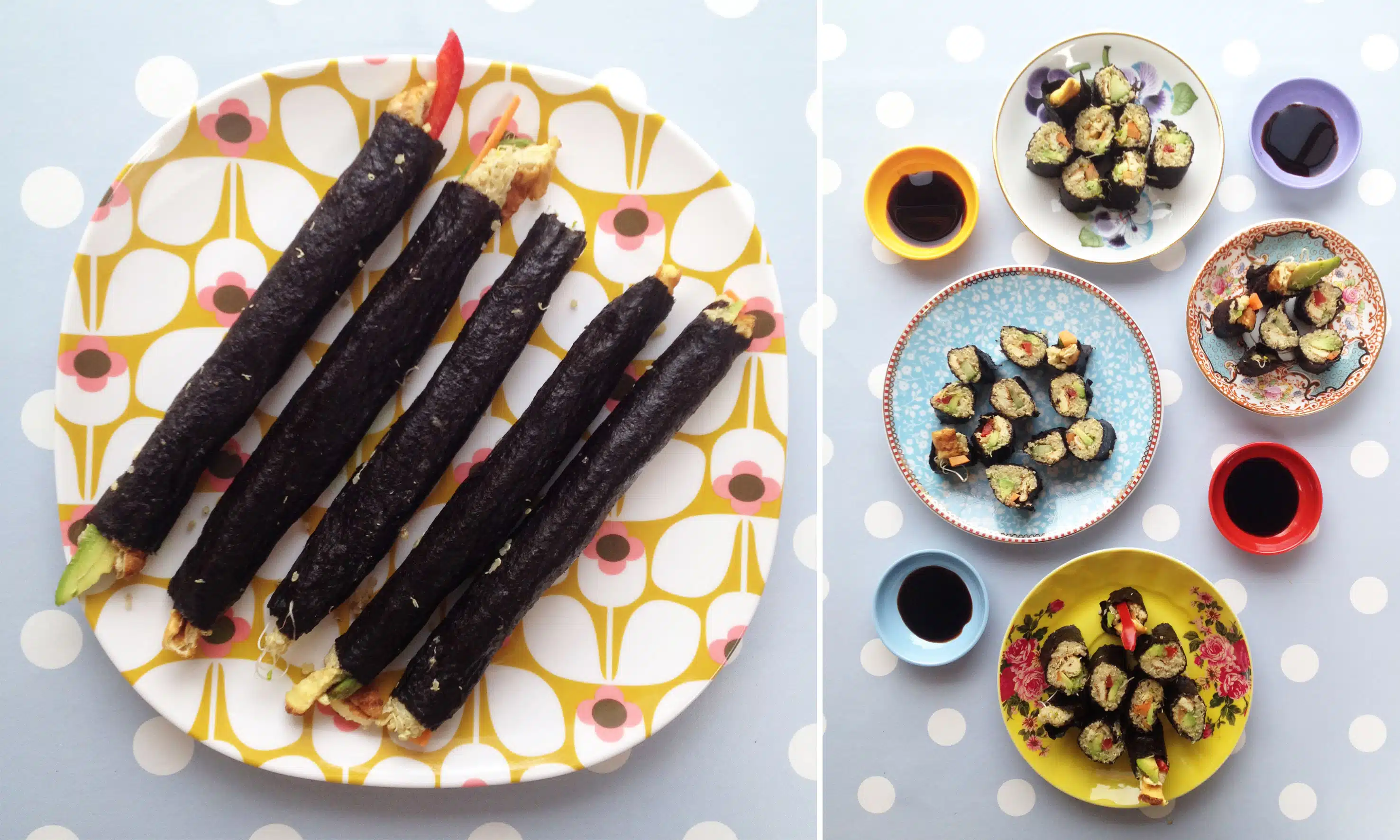 Ik gebruikte biologische standaard hummus. Als je niet dagelijks sushi rolt en je moet de techniek weer even onder de knie krijgen, is het wel handig een sushi kookboek bij de hand te hebben. Ik friste mijn geheugen nog even op met ‘simpel sushi’ van Emi Kazuko.