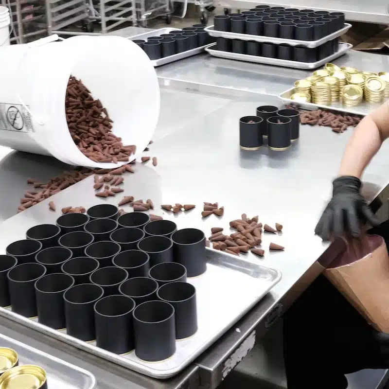 Alchemy Wierookkegels zijn verpakt in recycleerbare zwarte papieren kokers met daarin 30 kegels, met gouden metalen deksels die als branders functioneren wanneer ze ondersteboven op een hittebestendig oppervlak staan. Onze wierookkegels op houtbasis worden in onze fabriek in Los Angeles met de hand in fijne geuroliën gedoopt.