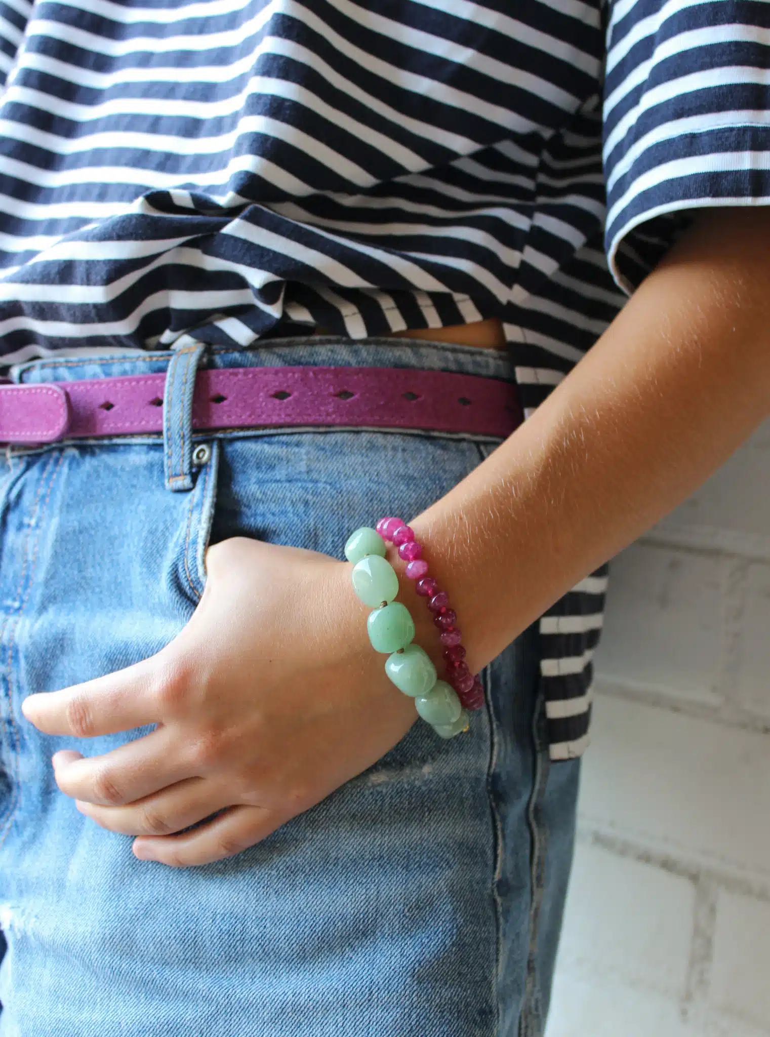 Geef je look wat kleur met deze hand geknoopte roze Jade armband. De mooie donker roze tint van de Jade geeft een subtiele, natuurlijke glans die moeiteloos elke outfit verrijkt. Draag de armband solo voor een tijdloze uitstraling of combineer hem met andere sieraden voor een speelse, gelaagde look.