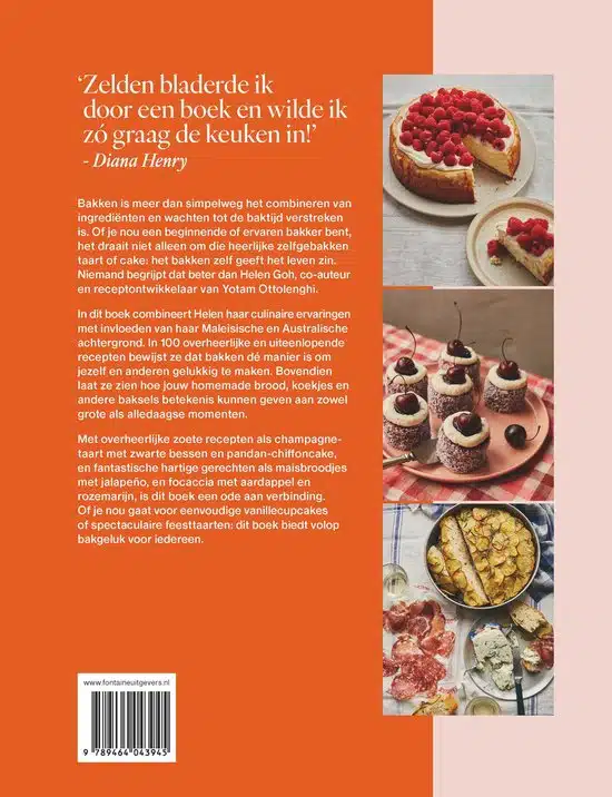 Niets maakt zo gelukkig als een perfecte, zelfgebakken taart of cake en niemand begrijpt dat beter dan Helen Goh. Daarom vertrouwen bakliefhebbers ook al jaren op haar foolproof bakrecepten. Al meer dan tien jaar is zij als co-auteur en receptontwikkelaar de drijvende kracht achter bijna alle zoete creaties uit Yotam Ottolenghi’s wereldberoemde kookboeken. Bovendien weet Helen als geen ander dat bakken om meer draait dan alleen smaak: het verbindt en geeft betekenis aan zowel grote als alledaagse momenten. In haar eerste soloboek biedt ze ons dan ook niet alleen haar beste bakrecepten, maar evenzoveel manieren om het leven zin te geven. Of je nu kiest voor overheerlijk zoet – een pandan-chiffoncake, champagnetaart met zwarte bessen – of een van de fantastische hartige gerechten als maisbroodjes met jalapeño of focaccia met aardappel, knoflook en rozemarijn: elke hap is levensgeluk in haar puurste vorm.