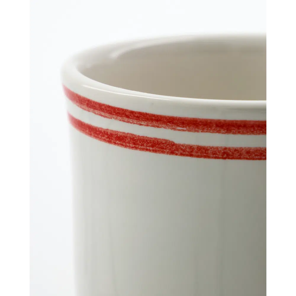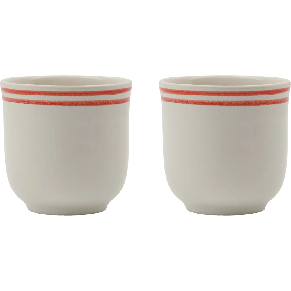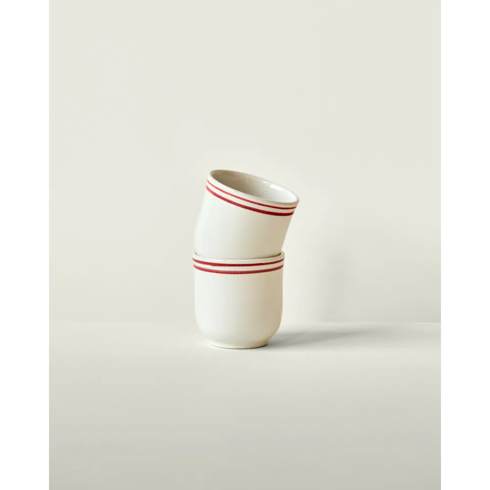 Set van twee mokjes van steengoed met een klassieke Bistro rand. Het geglazuurde oppervlak en de duurzame afwerking zorgen voor een tijdloze bistro-uitstraling.