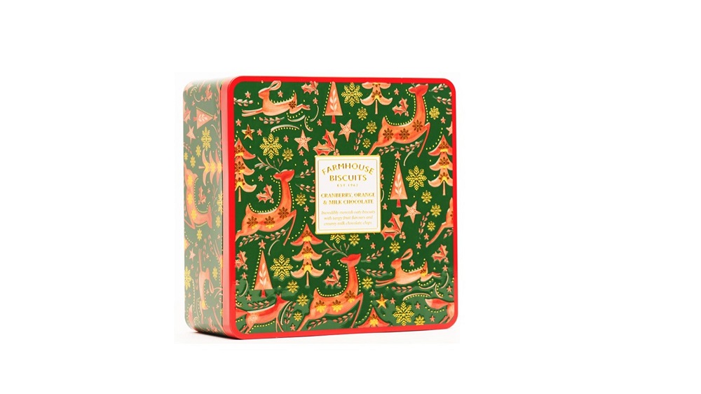 Dit gezellige blik met verschillende kerstfiguren bevat cranberry, sinaasappel en chocoladekoekjes. Dit blik past onder elke kerstboom.