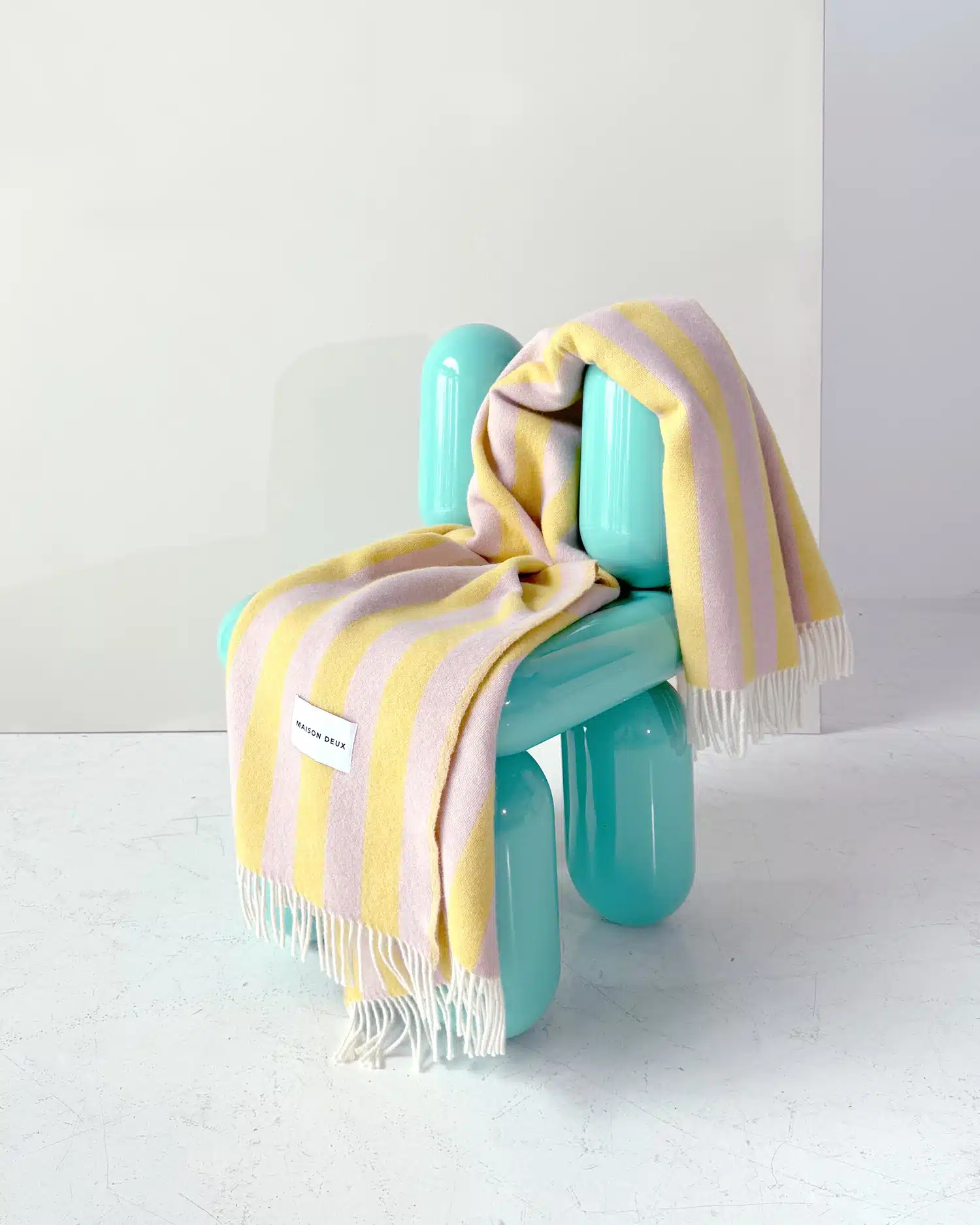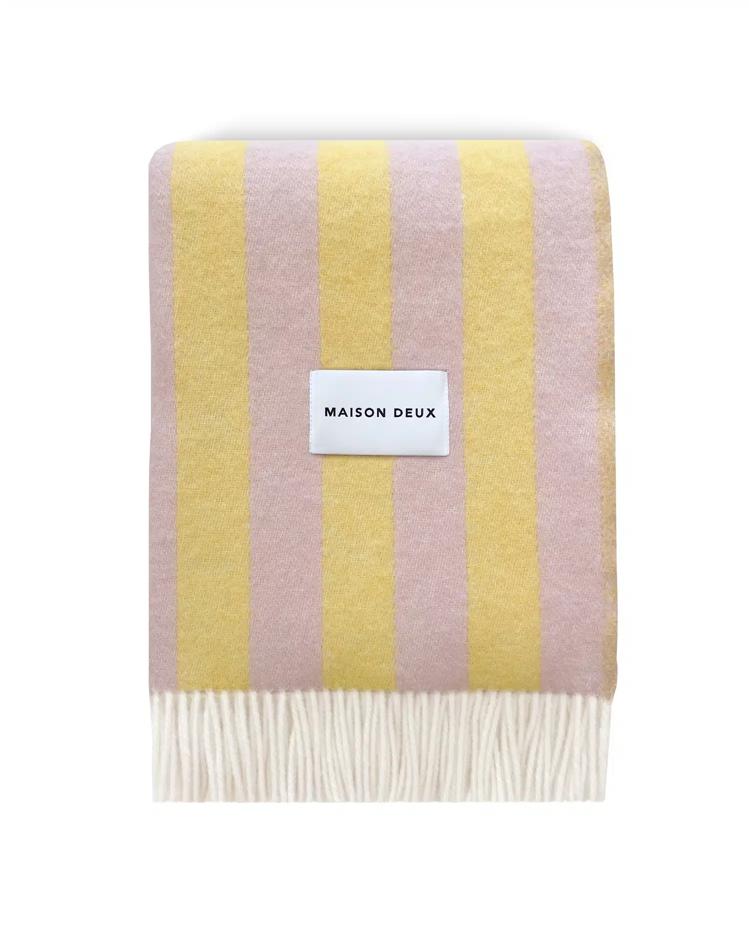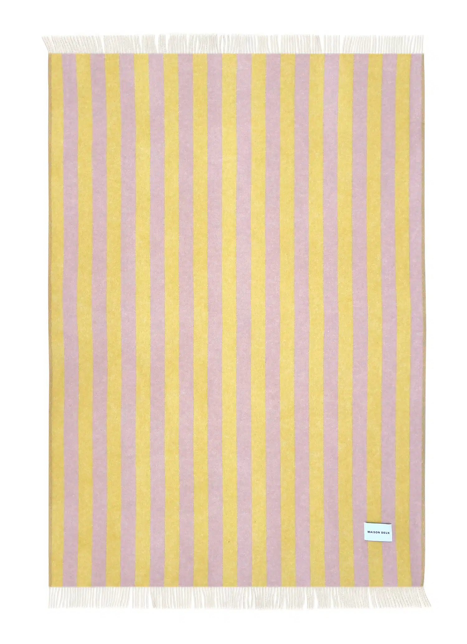 Het Candy Wrap Plaid Geel Roze is jacquard geweven van 100% Nieuw-Zeelandse wol met franjes aan de korte zijden. Een dikke wollen deken met een omgekeerde print aan de achterzijde.