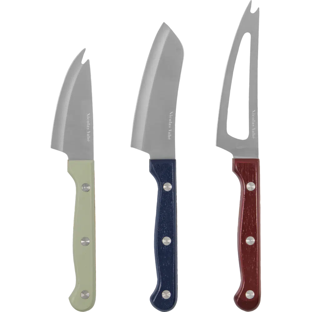Set van drie kaasmessen met acaciahouten handvaten in rood, wit en blauw. Perfect voor het snijden van zowel harde als zachte kazen. De messen zijn gemaakt van scherp roestvrijstaal