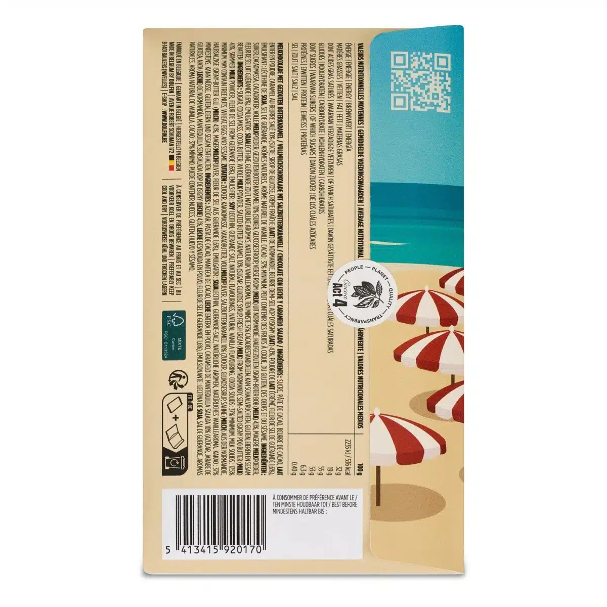 Ingrediënten : Suiker, cacaomassa, cacaoboter, volle melkpoeder, gezouten boter karamel 10% (suiker, glucosestroop, verse room (melk) uit Normandië, halfgezouten Isigny-boter BOB (melk) 4,1%, magere melkpoeder, fleur de sel uit Guérande 1,6%), emulgator: sojalecithine, Guérande zout, natuurlijke aroma’s, natuurlijk vanillearoma. Ten minste 37% cacaobestanddelen. Kan schaalvruchten, gluten, eieren en sesam bevatten.