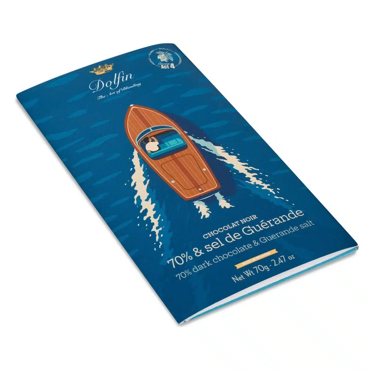 Op open zee snijdt een boot door de golven. Krachtig en verfijnd onthult deze pure chocolade met 70% cacao haar volle diepte, versterkt door de subtiele finesse van Guérande zout. Een tablet met uitgesproken karakter, voor liefhebbers van pure smaken.