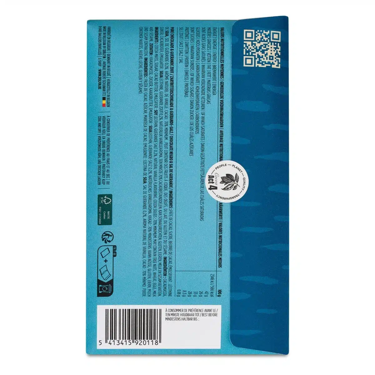 Ingrediënten : Cacaomassa, suiker, cacaoboter, emulgator : sojalecithine, Guerande zout 0,2%, natuurlijk vanillearoma. Ten minste 70% cacaobestanddelen. Kan schaalvruchten, gluten, eieren, melk en sesam bevatten.