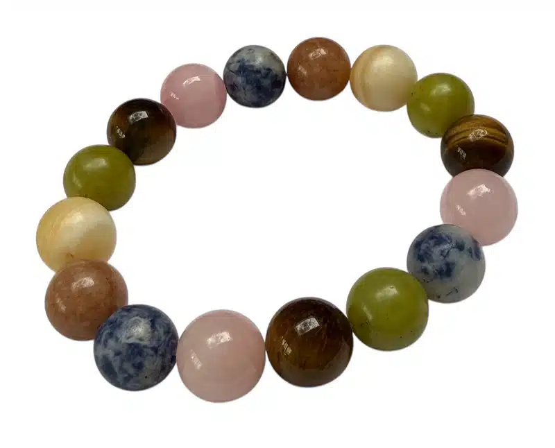 Tijgeroog staat voor kracht, de Jaspis voor emotionele harmonie, gele jade voor plezier en geluk en de olijfkleurige jade voor emotionele balans.