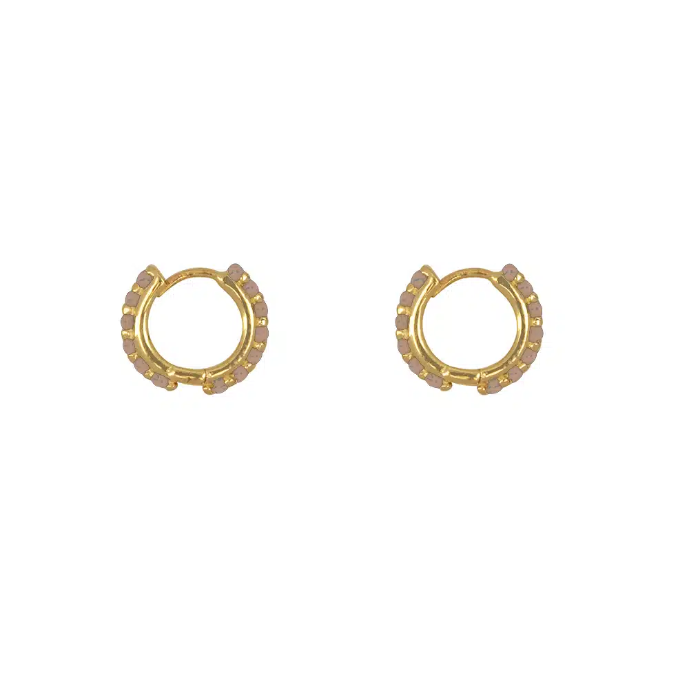 De Balls Click Hoop Earring Green is een paar ronde oorbellen met daarop kleine bolletjes met beige emaille die je dicht kunt klikken.