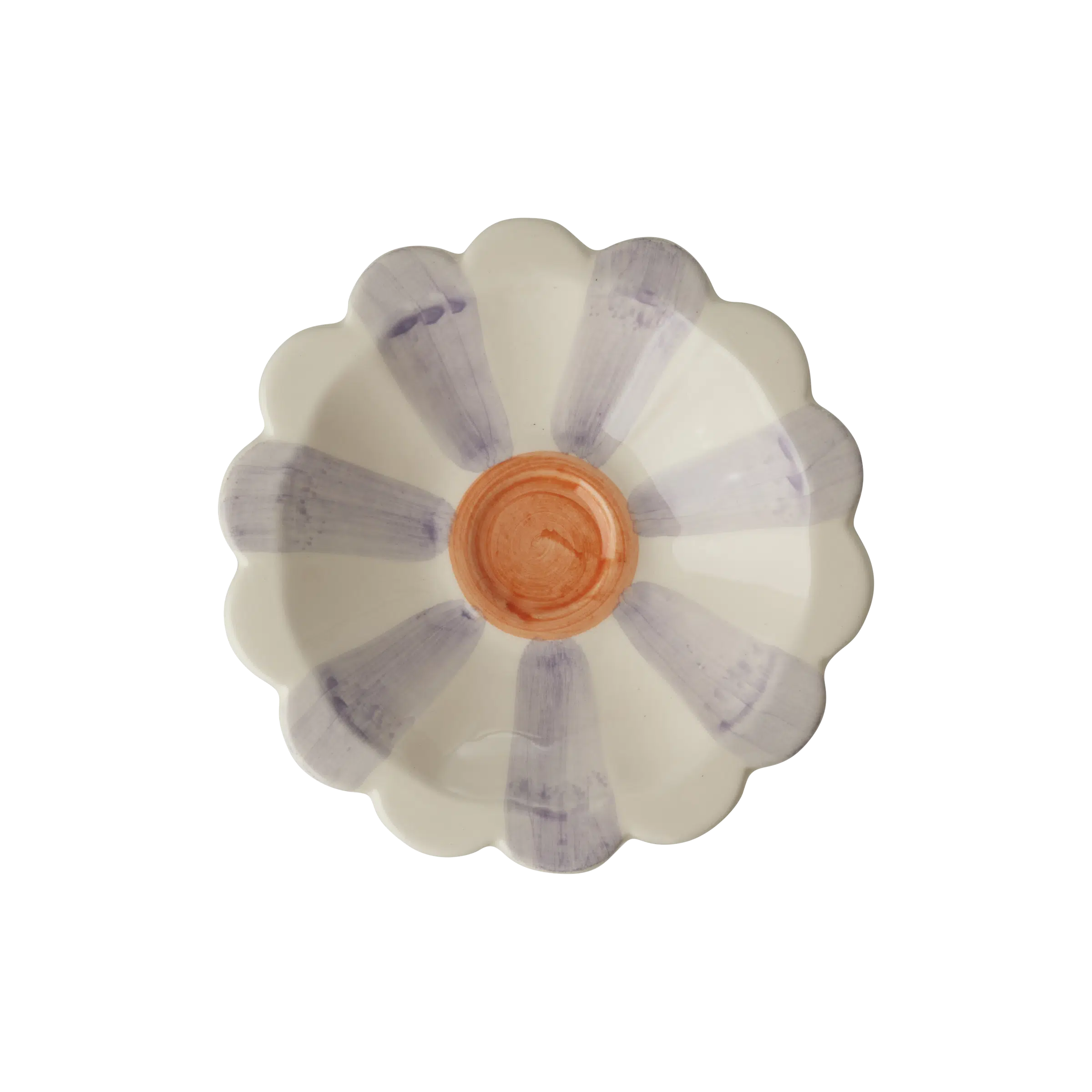 Word helemaal verliefd op dit prachtige kommetje met een op bloemen geïnspireerd ontwerp en met mooie lila strepen. Gebruik het schaaltje als sideplate, als dipschaaltje met olijfolie met kruiden of heerlijk zelfgemaakte humus of zet het schaaltje op jouw slaapkamer voor jouw allermooiste sieraden. Oneindig veel mogelijkheden!