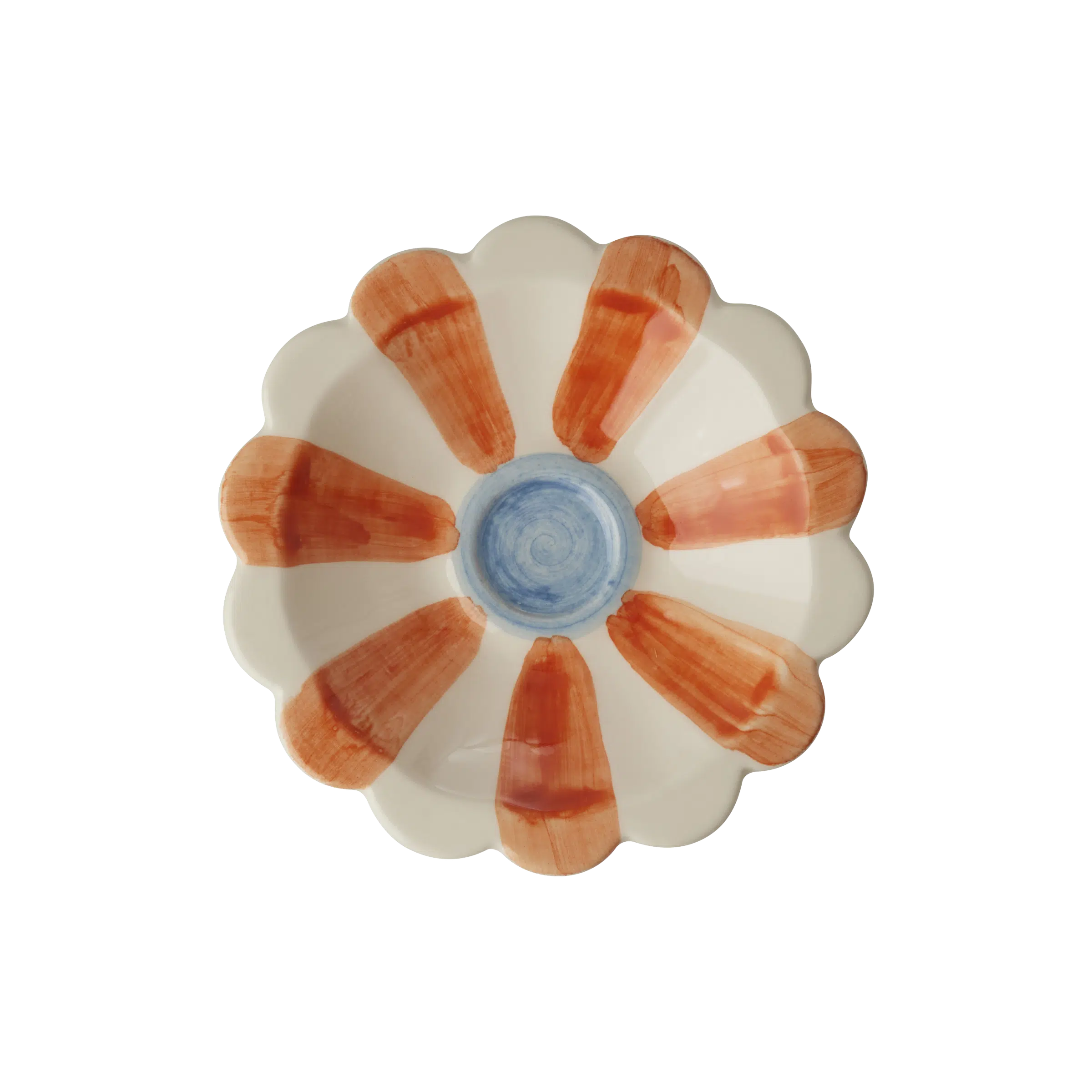 Word helemaal verliefd op dit prachtige kommetje met een op bloemen geïnspireerd ontwerp en met mooie oranje strepen. Gebruik het schaaltje als sideplate, als dipschaaltje met olijfolie met kruiden of heerlijk zelfgemaakte humus of zet het schaaltje op jouw slaapkamer voor jouw allermooiste sieraden. Oneindig veel mogelijkheden!