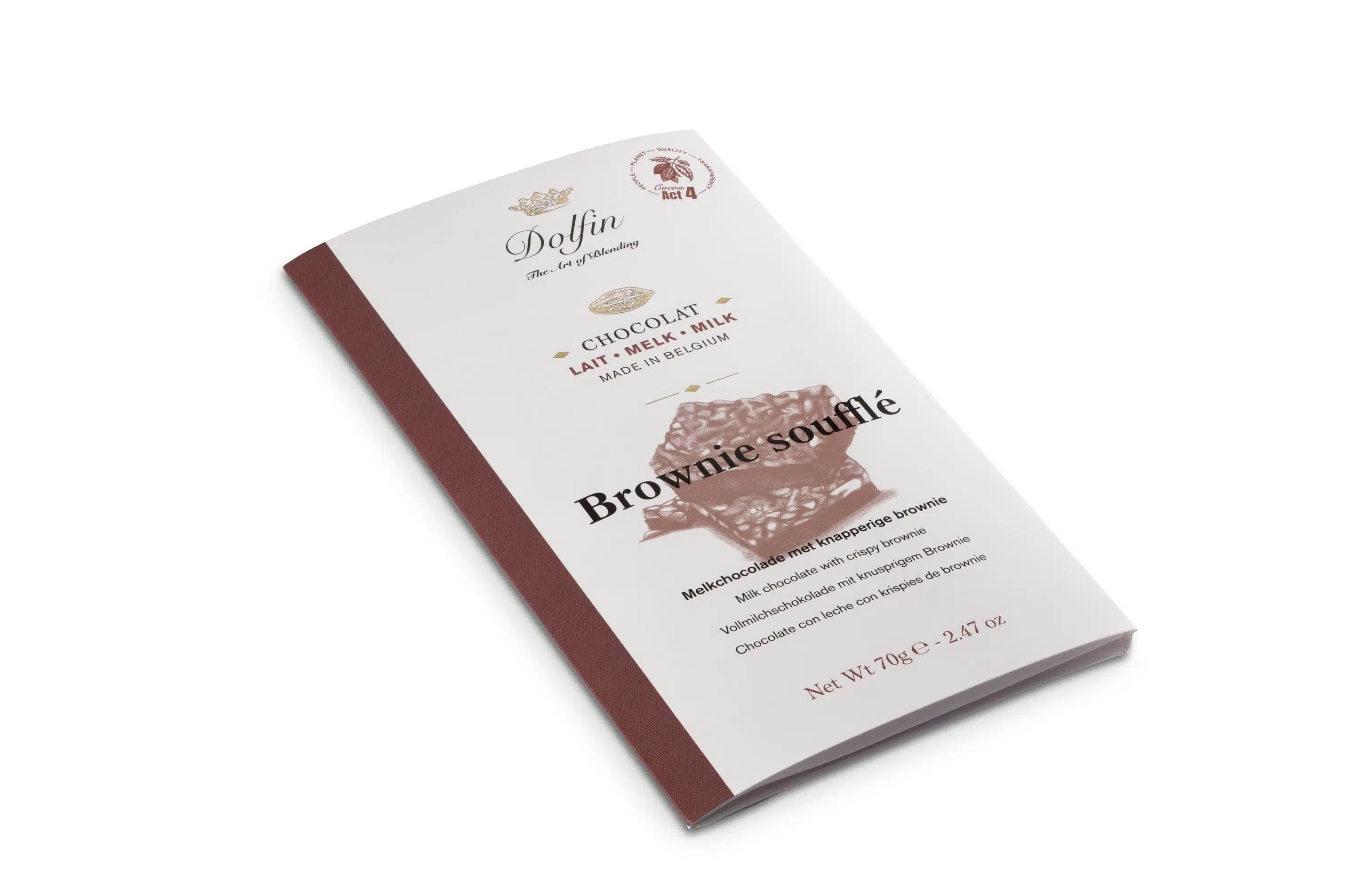 De brownie, afkomstig uit de Verenigde Staten, heeft ieders hart veroverd. Daarom lanceert Dolfin een nieuwe reep melkchocolade en gepofte brownies. In deze reep vinden we alle delicatesse van melkchocolade, versterkt door de knapperigheid van de gepofte brownie.
