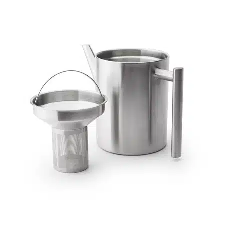 Deze strakke dubbelwandige theepot van Bredemeijer houdt de thee lekker lang warm. De hele theepot is gemaakt van mat RVS en mag in de vaatwasser.