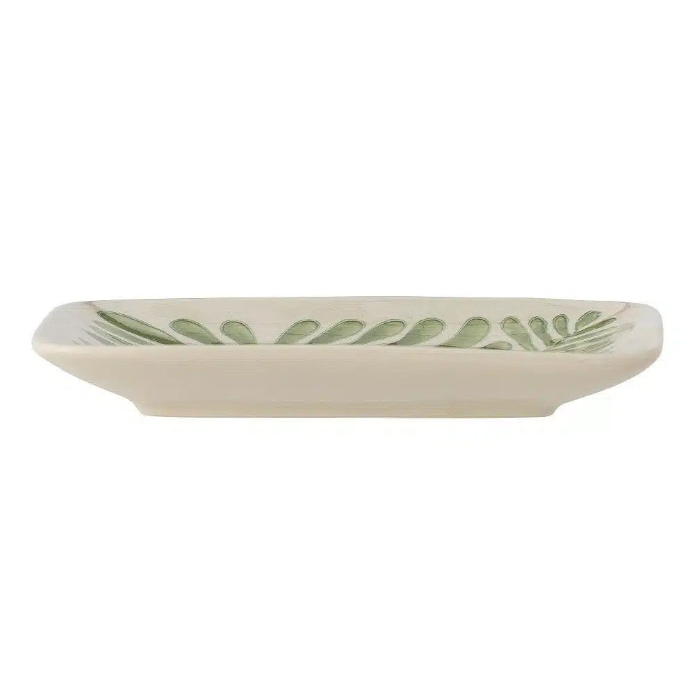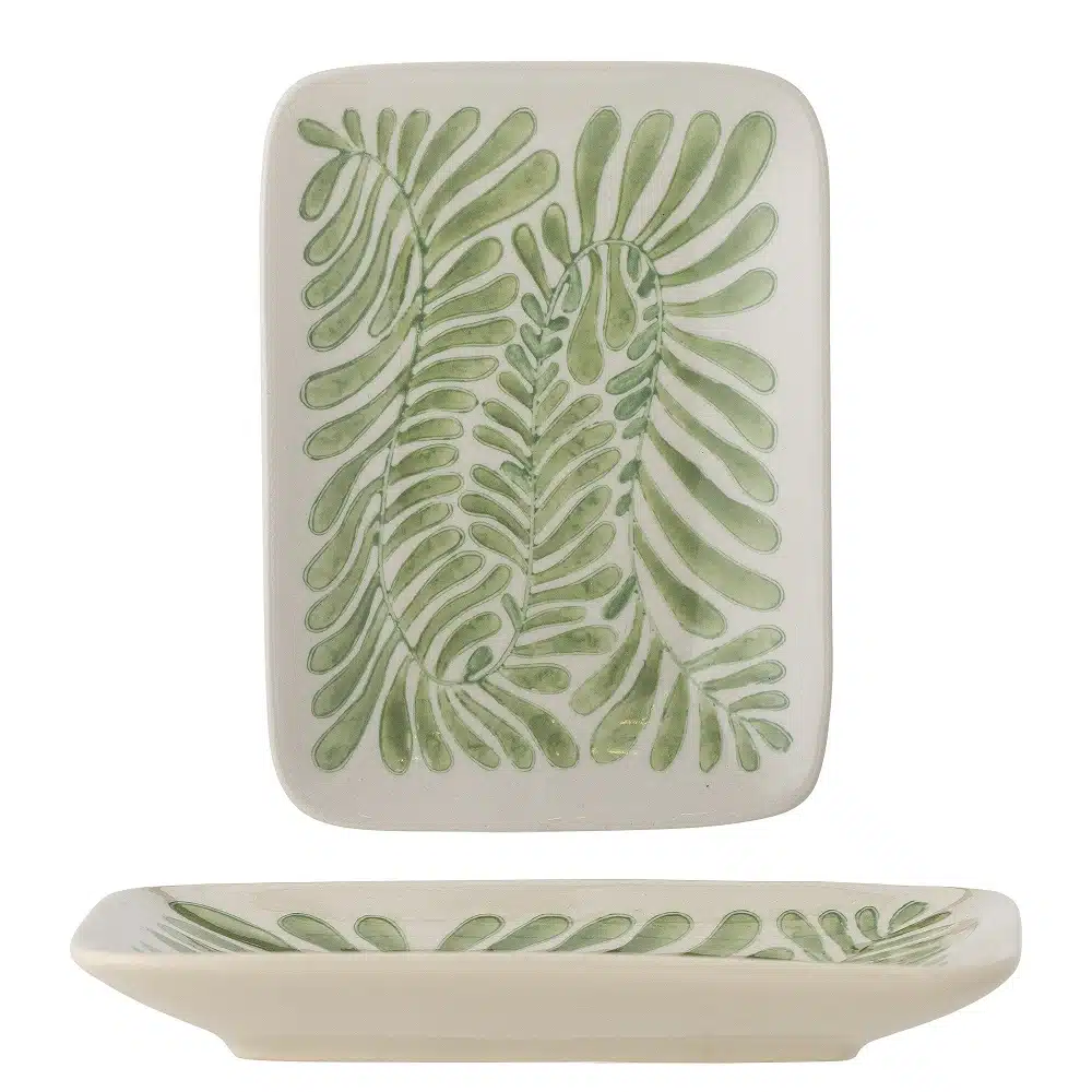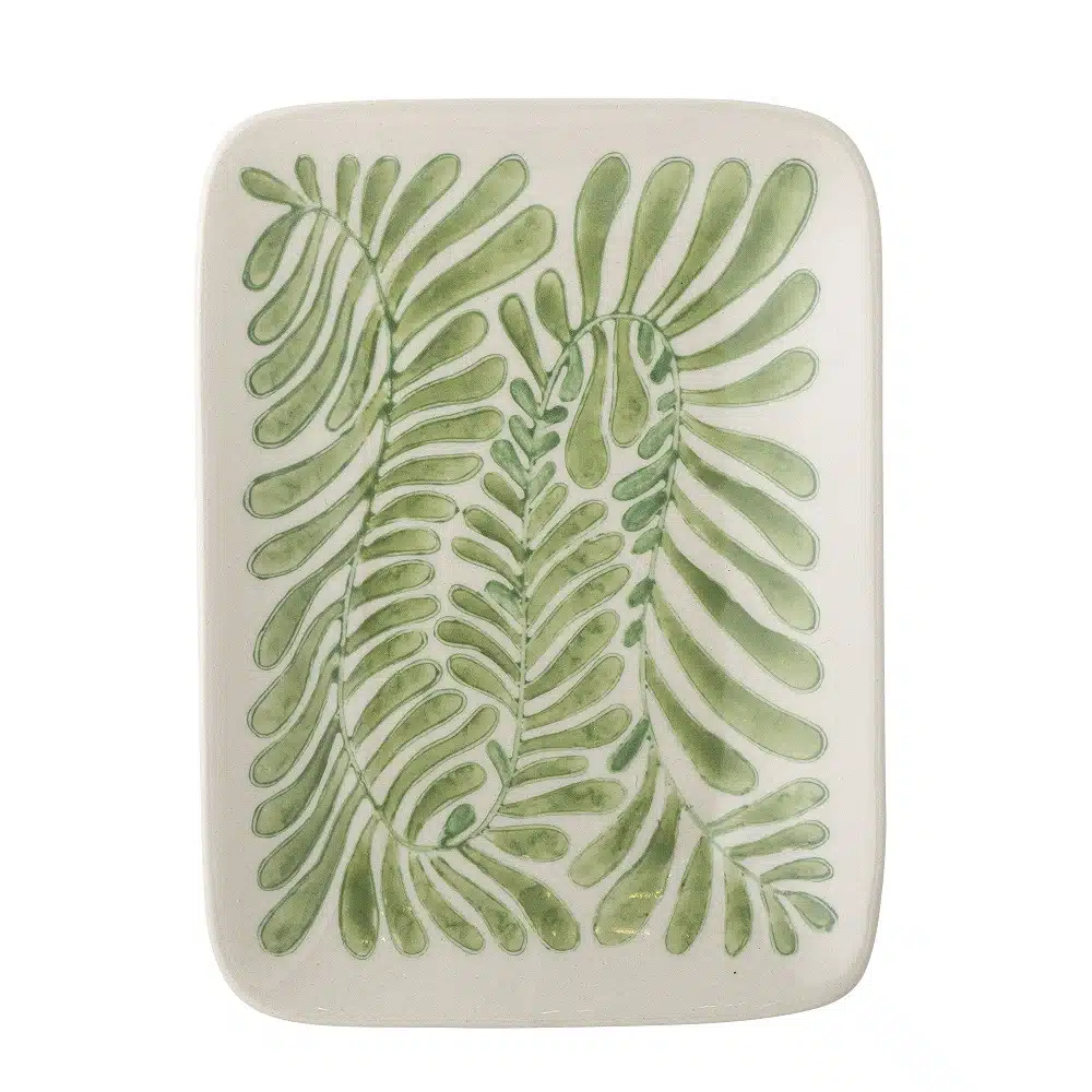 De Fauni Plate is een prachtig stenen bordje met een rechthoekige vorm. Perfect voor het serveren van een koekje of chocolaatje, of voor het opbergen van sieraden. Het dienblad is met de hand beschilderd met een plantenmotief, dat mooi afsteekt tegen de lichte achtergrondkleur.