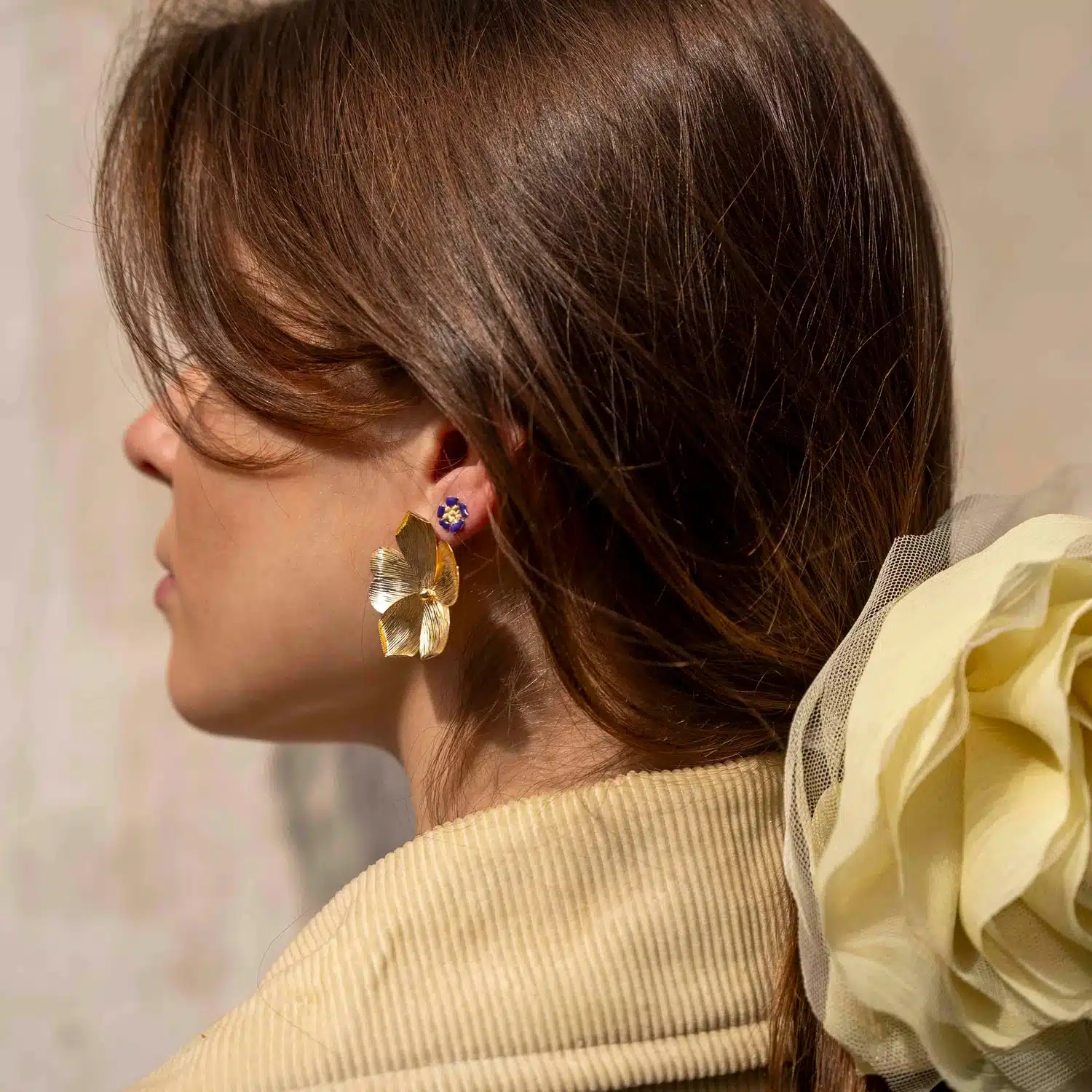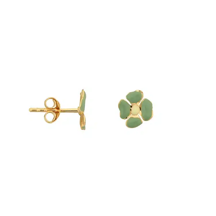 De Medium Folded Clover Stud Earring Green Enamel is een paar stud oorbellen in de vorm van een klavertje vier met groen emaille erop. De oorbel heeft een diameter van ca 1 cm.