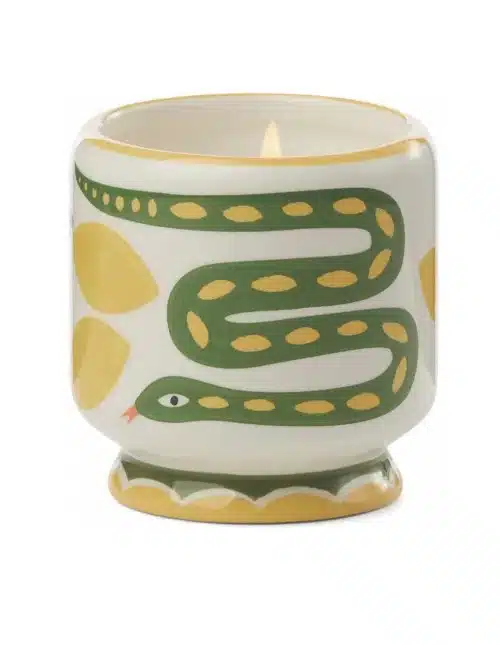 Een lekkere geurkaars in een keramieken pot met handbeschilderde details. Deze kaars heeft de geur van Wilde Citroengras. Als de kaars is opgebrand heb je een leuk potje voor een plant, een nieuwe kaars of wat anders.