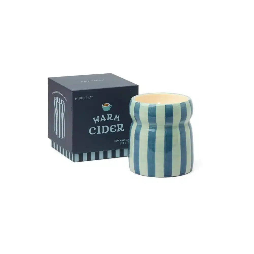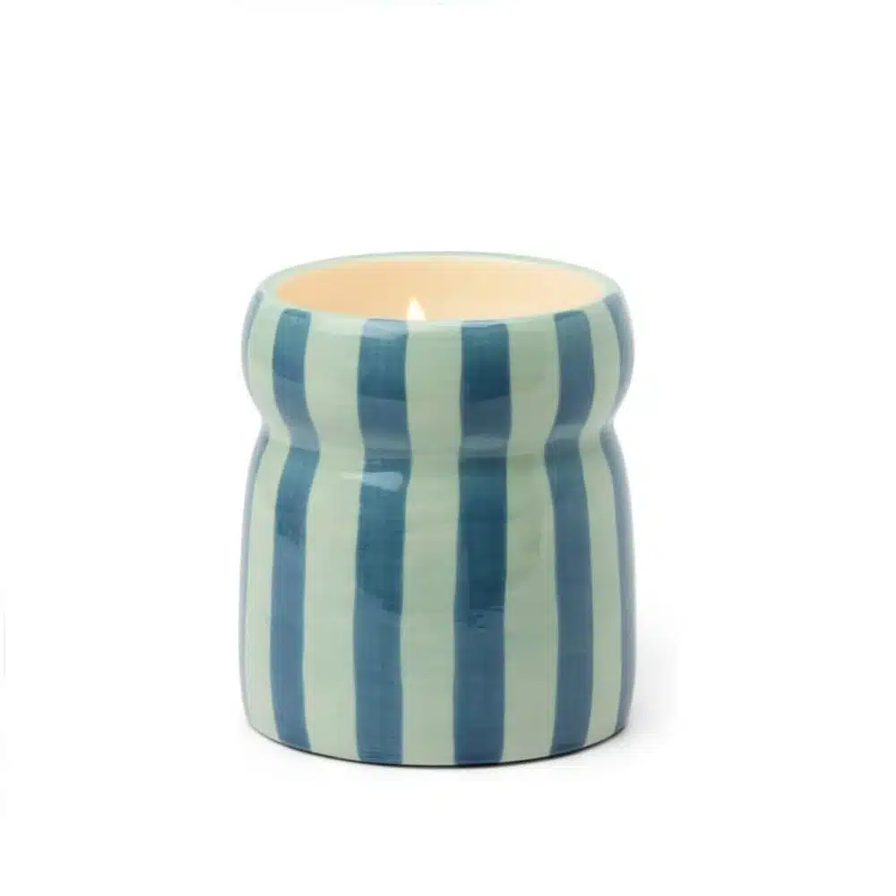 Een leuke en lekkere geurkaars in een keramieken pot met handbeschilderde details – geïnspireerd op gestreepte parasols aan de mooiste stranden van de wereld.