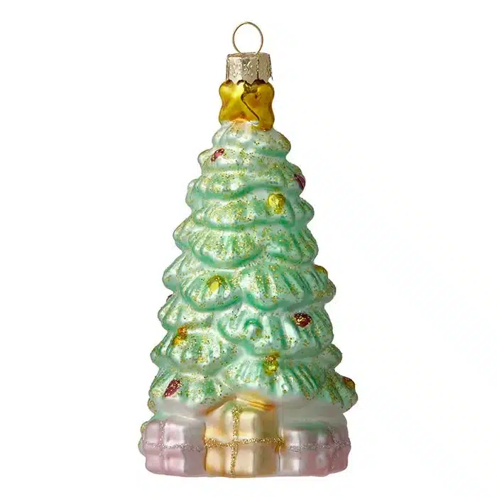 Kerstglasornament in de vorm van een vrolijke groene kerstboom.
