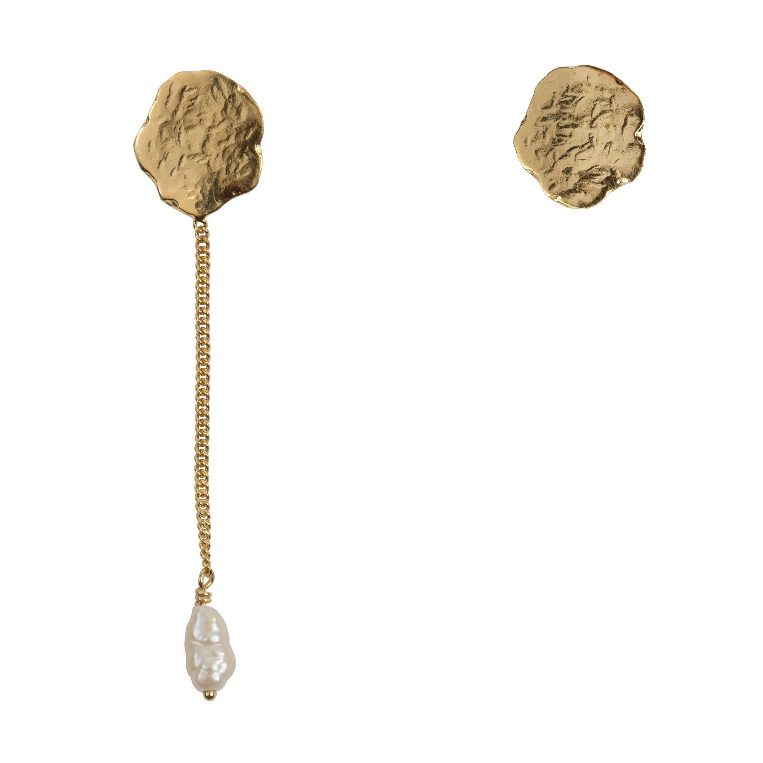 De Hammered Flat Coin Chain Pearl Stud Earring Gold Plated is een paar stud oorbellen met een platgeslagen muntje met aan een kant een stukje chain en een pareltje. Het muntje heeft een diameter van ca 1 cm.