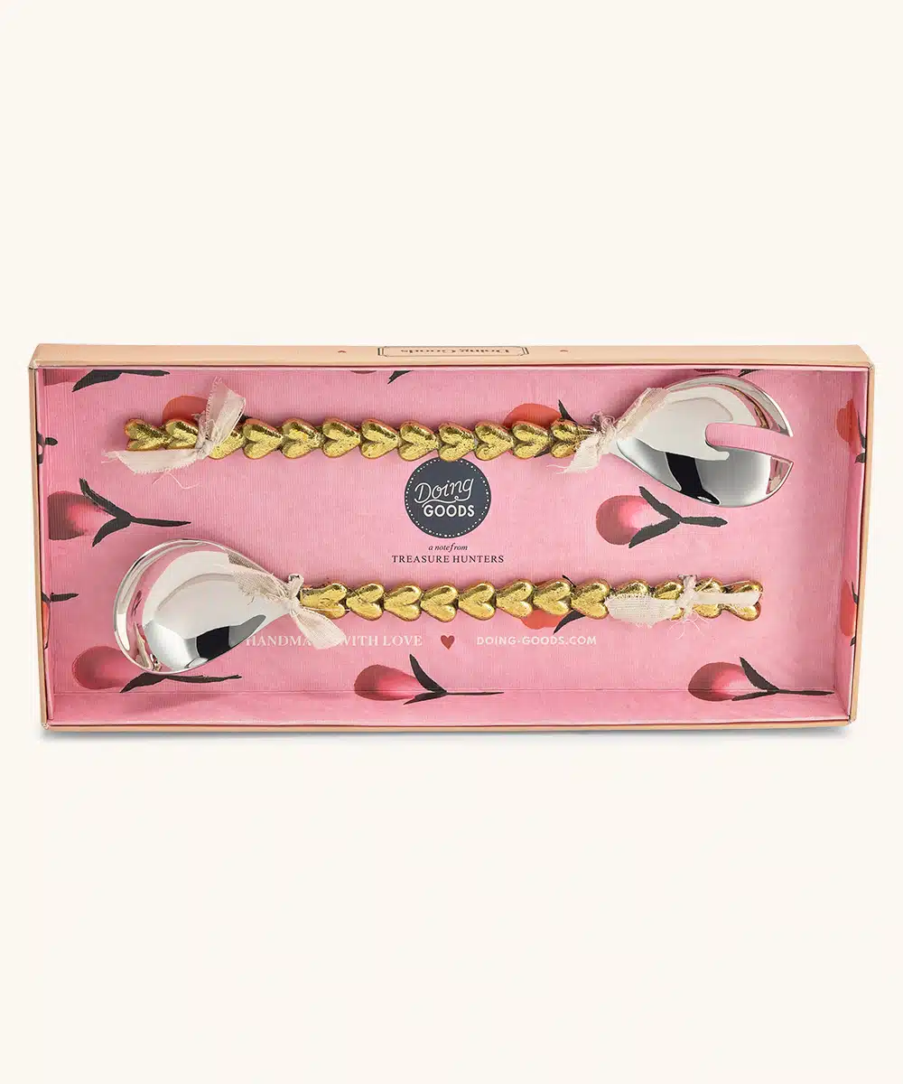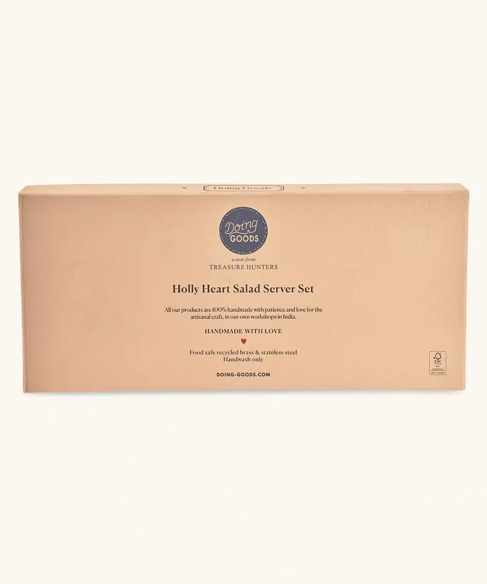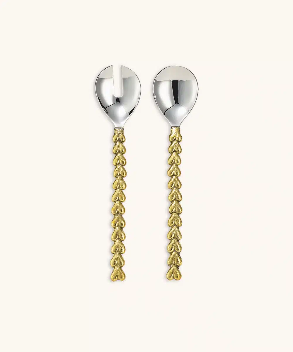 Geef je salades een stijlvolle touch met het Holly Hart Saladebestek. Deze handgemaakte set van gerecycled messing en roestvrij staal heeft prachtige handvatten met hartjes en ligt heerlijk in de hand.