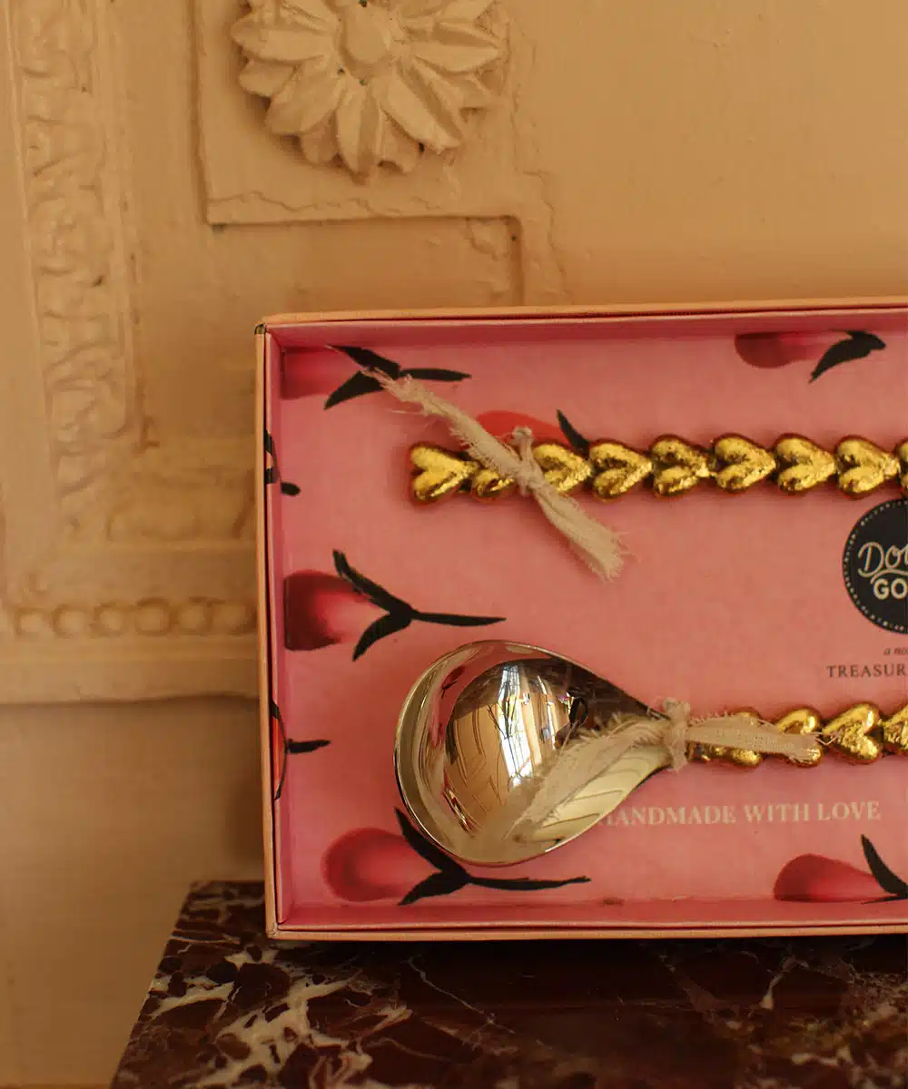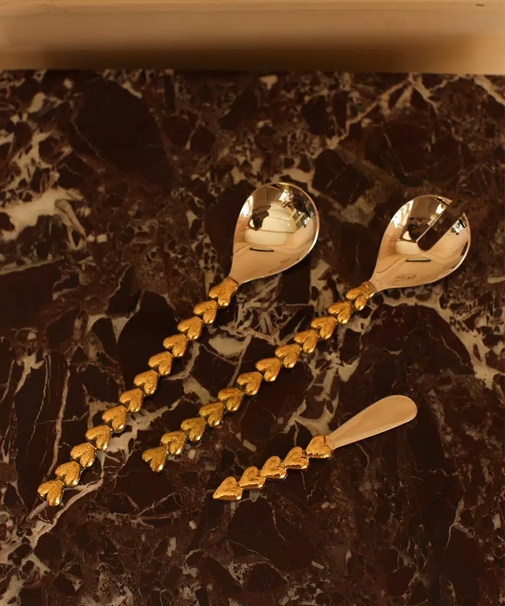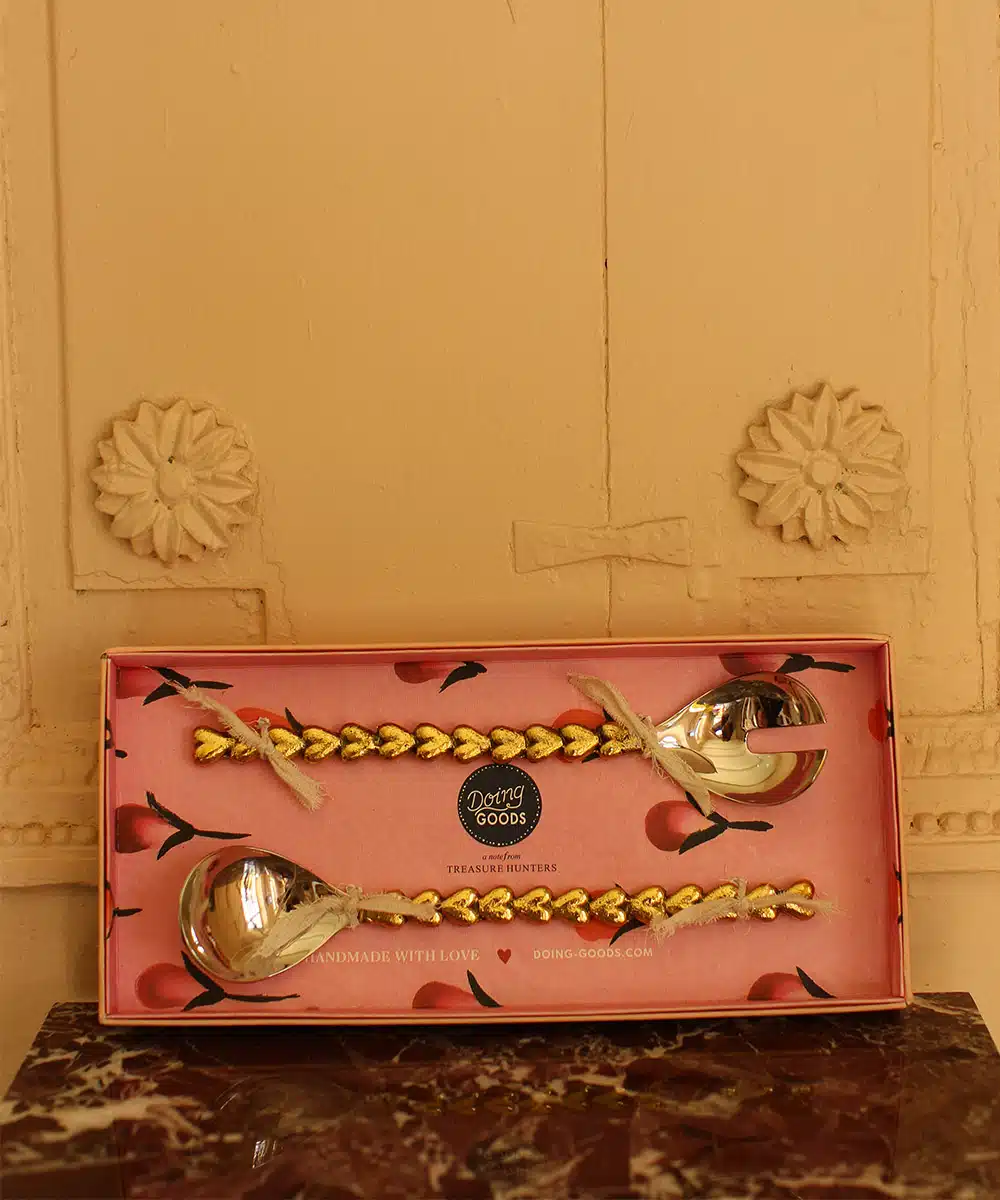 Geef je salades een stijlvolle touch met het Holly Hart Saladebestek. Deze handgemaakte set van gerecycled messing en roestvrij staal heeft prachtige handvatten met hartjes en ligt heerlijk in de hand.
