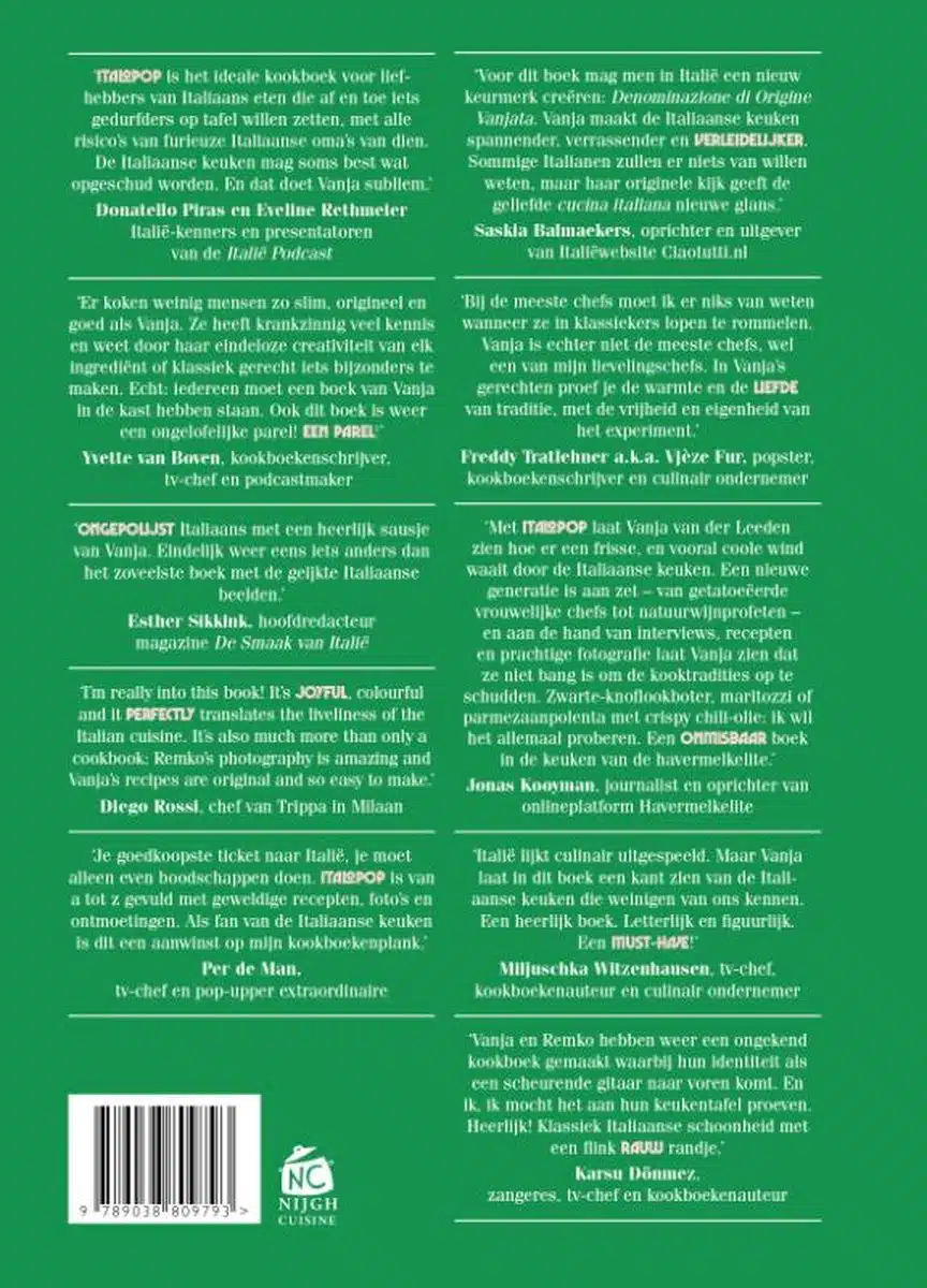 Italopop is het ideale kookboek voor liefhebbers van Italiaans eten die af en toe iets gedurfders op tafel willen zetten, met alle risico’s van furieuze Italiaanse oma’s van dien. De Italiaanse keuken mag soms best wat opgeschud worden. En dat doet Vanja subliem.