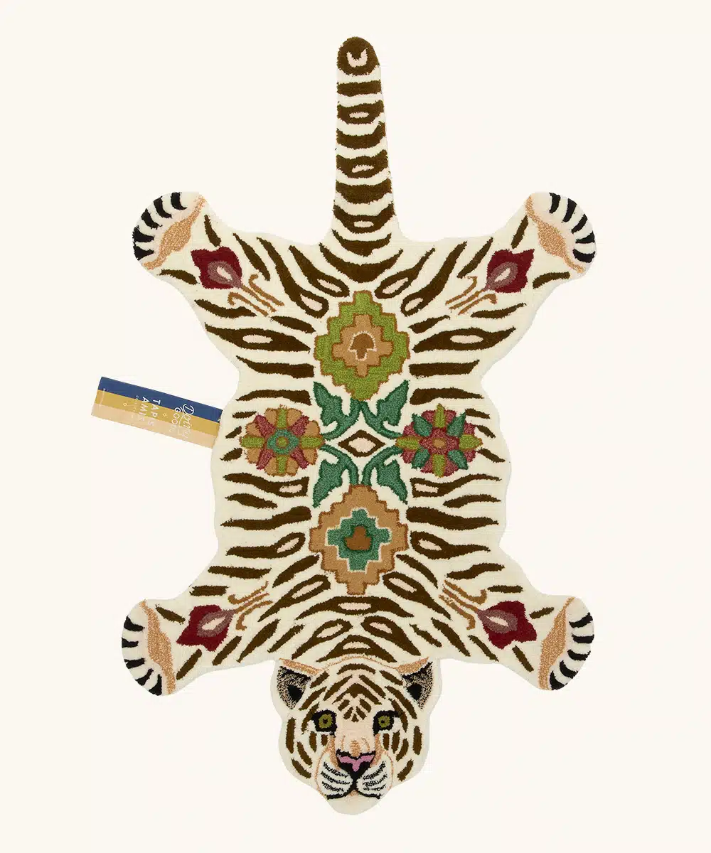 Het Jill Tijger Vloerkleed Groot is een handgemaakt wollen vloerkleed met katoenen achterkant, ontworpen als speelse blikvanger in je interieur. Het subtiele tijgerdesign met bloemenpatroon geeft een vrolijk accent, terwijl de neutrale beige tint moeiteloos past bij elke woonstijl. Zacht, duurzaam en stijlvol – ideaal voor babykamer, kinderkamer of woonkamer.
