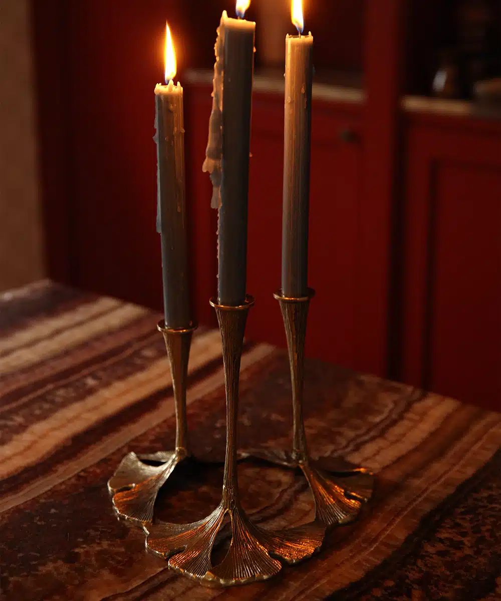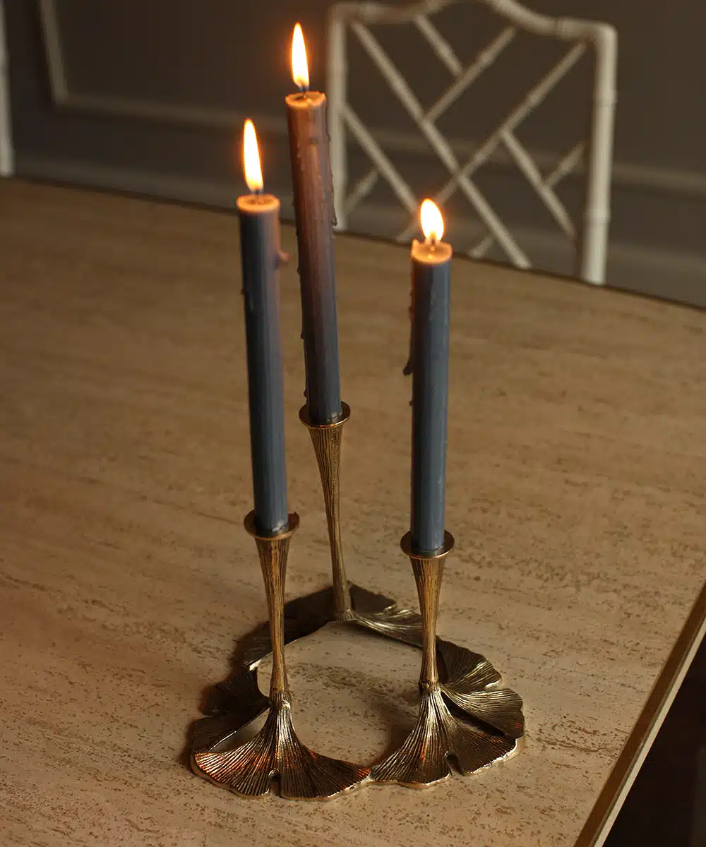 een echte eye-catcher op jouw tafel! Deze prachtige 3-armige Ginko-kandelaar is een sieraad voor jouw interieur. Steek jij de kaarsen aan?