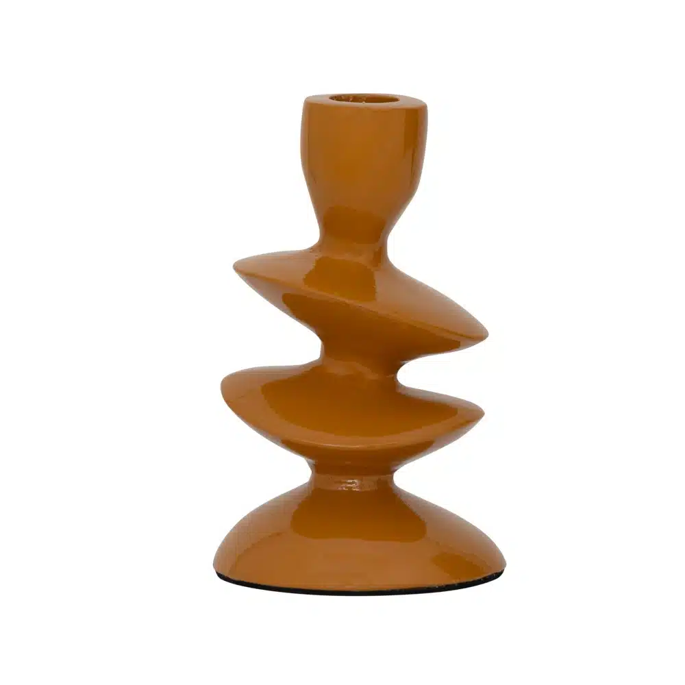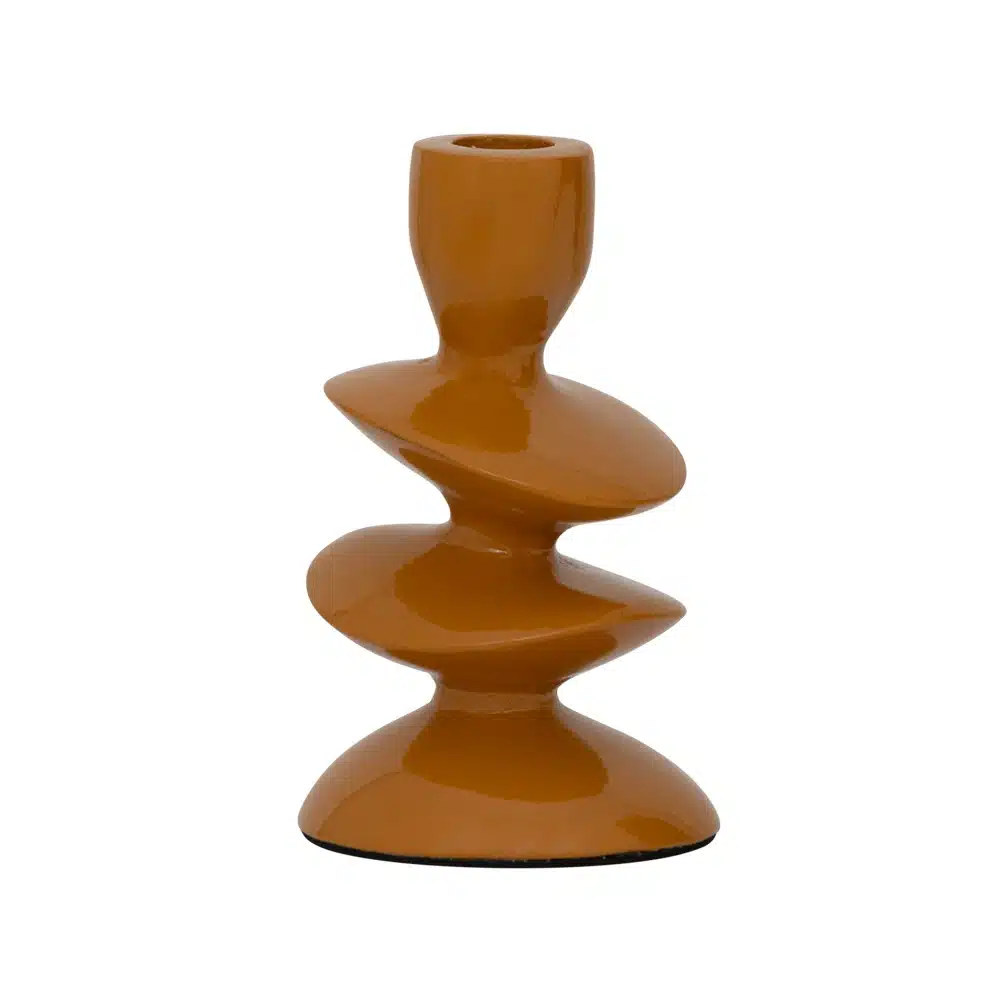 Deze opvallende kandelaar in Inca-goud heeft dansende schijven die in een speelse compositie zijn gestapeld. Voeg kleur en vorm toe aan je plank of tafel decor.