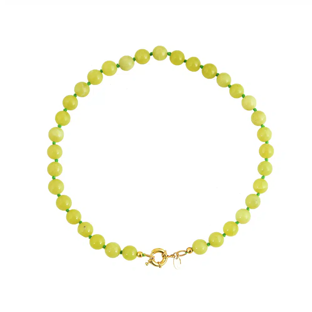 Deze ketting met groene jade kralen is handgeregen en afgewerkt met een 18k verguld messing slot. De vrolijke kleur maakt hem speels om te combineren. Perfect om solo te dragen of te mixen met je favoriete bedels.