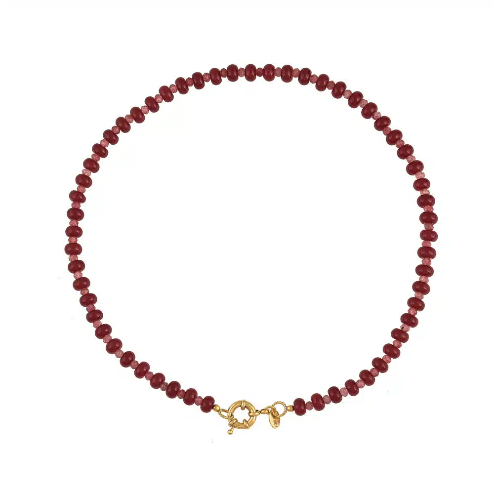 Deze ketting is hand geregen met ruby jade edelstenen, afgewerkt met een 18k verguld messing slot. De warme kleur maakt hem makkelijk te combineren. Perfect om solo te dragen of te mixen met je favoriete bedels.
