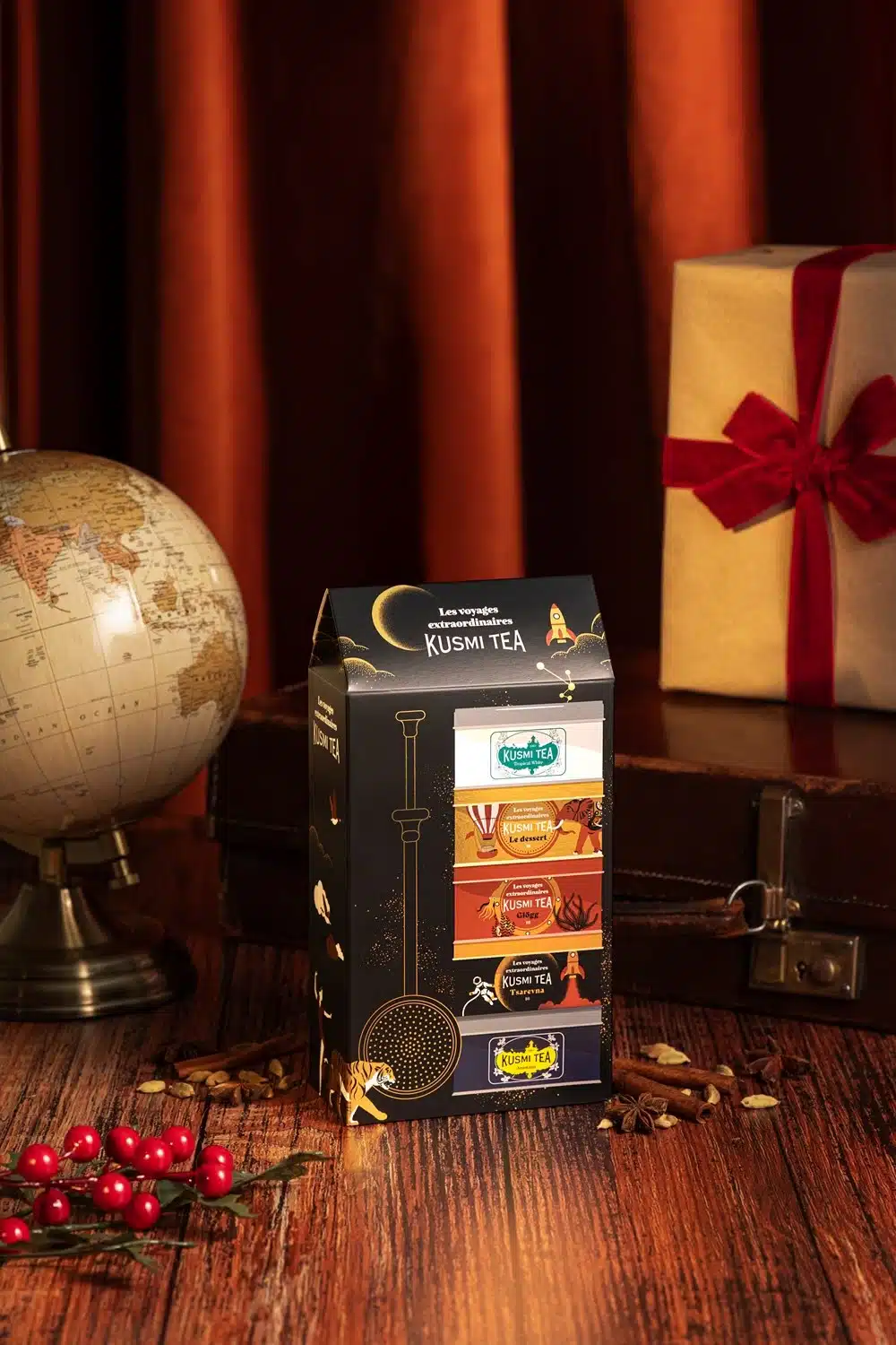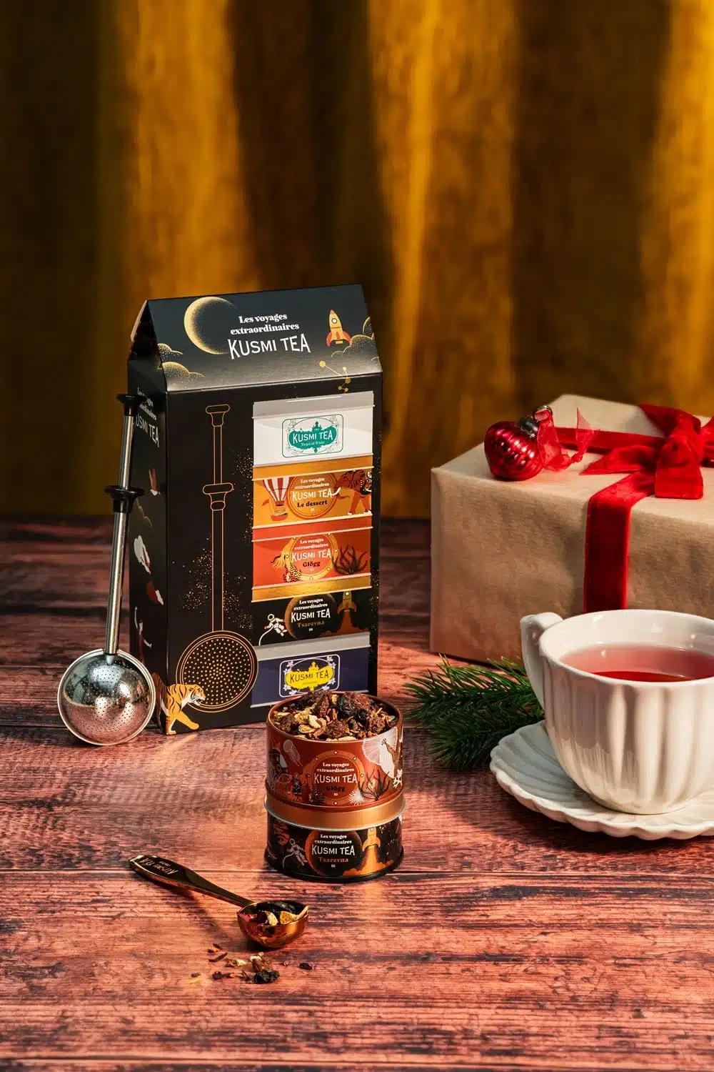 Het perfecte cadeau voor de feestdagen: deze nieuwe geschenkdoos met 5 miniatuurblikjes en telescopisch thee-ei. Vijf verschillende smaken om thuis te ontdekken of mee te nemen. Dit jaar neemt Kusmi Tea je tijdens de feestdagen mee op reis!