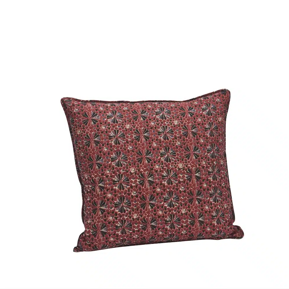 Deze kussenhoes, afkomstig uit India, is gemaakt van duurzaam katoen en heeft een verborgen ritssluiting. Het ontwerp bestaat uit een levendige mix van syrah, zwart, antraciet en beige, geïnspireerd op traditionele Indiase blokdrukken.