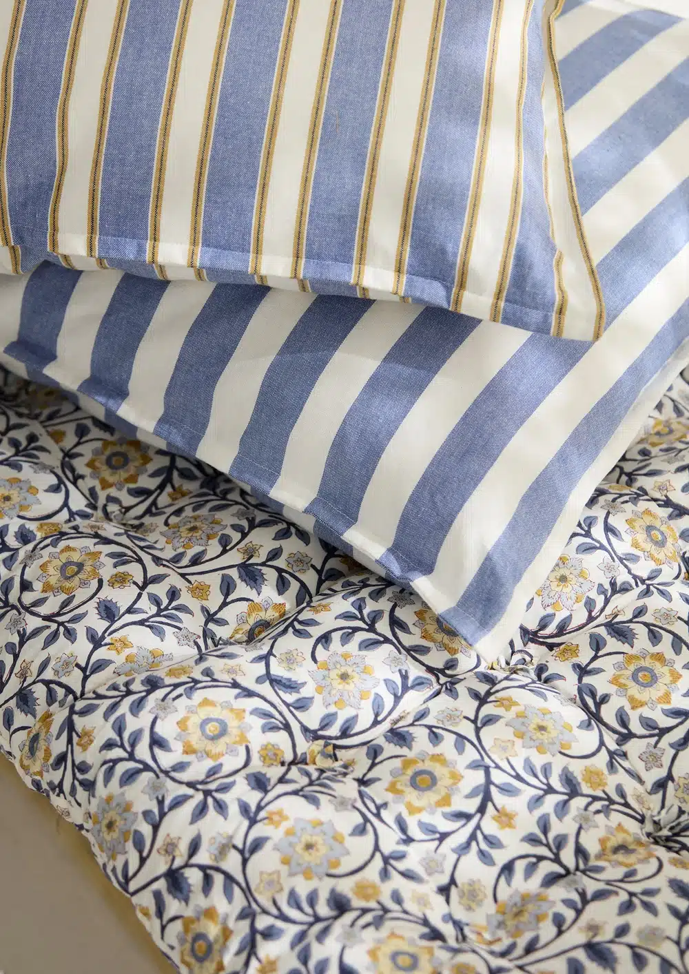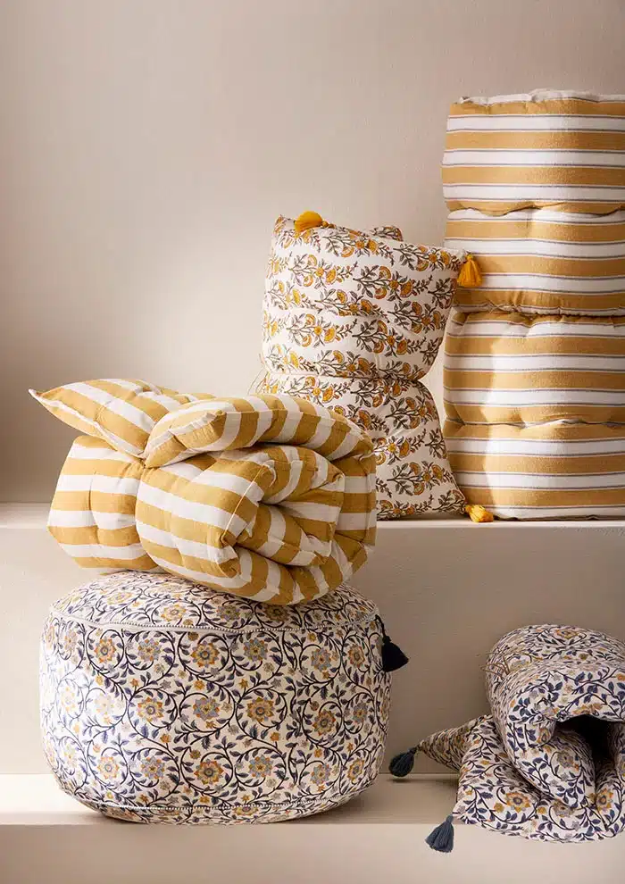 Een mooi matraskussen met handbedrukte blockprint voor in een stoel of op een bankje. Combineer verschillende prints of hou het juist rustig in combinatie met effen kleuren.