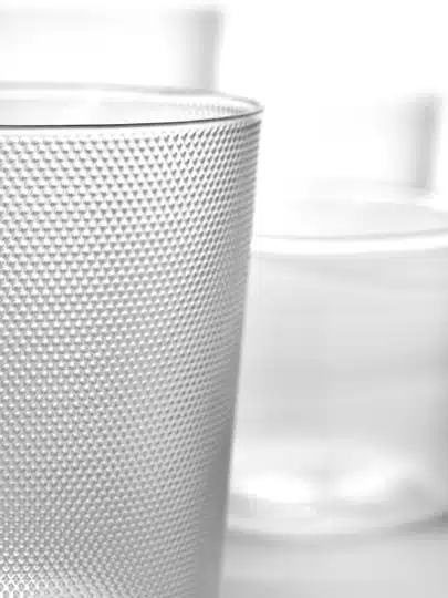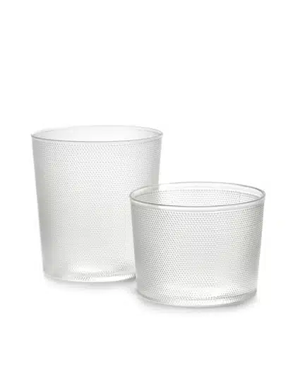 Een mooie simpele en toch bijzondere glas collectie door het samenspel van de strakke basisvorm met het getextureerde mondgeblazen glas.