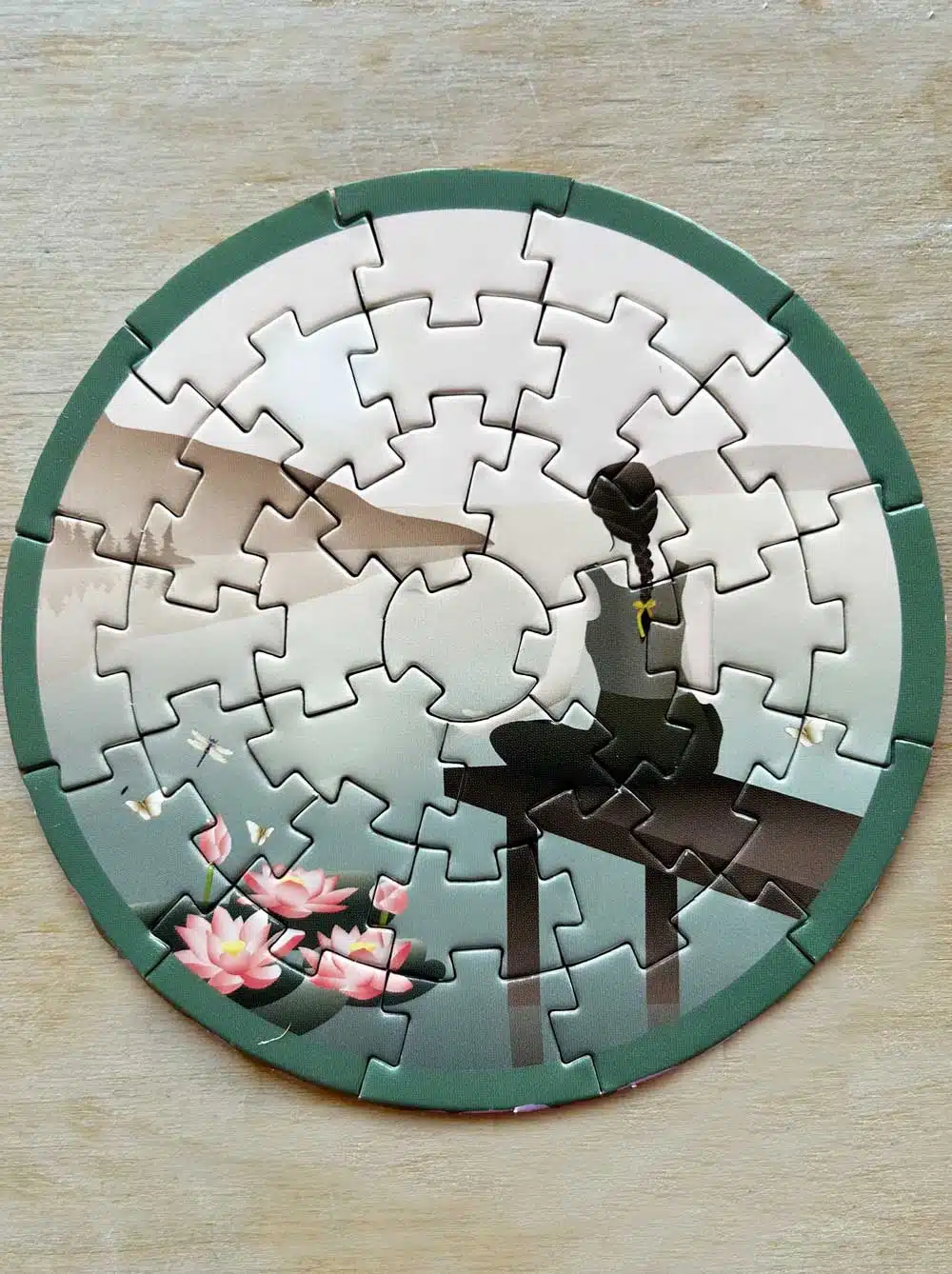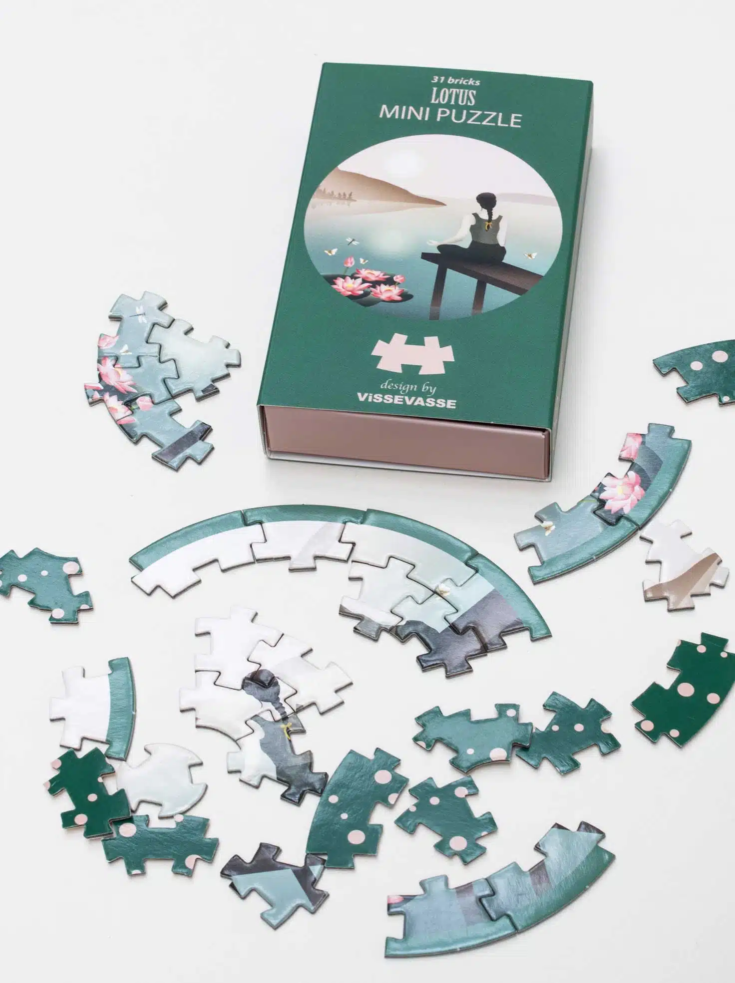 • De minipuzzel heeft 31 stukjes en heeft een diameter van 11 cm. De doos meet 11×6,5×2 cm