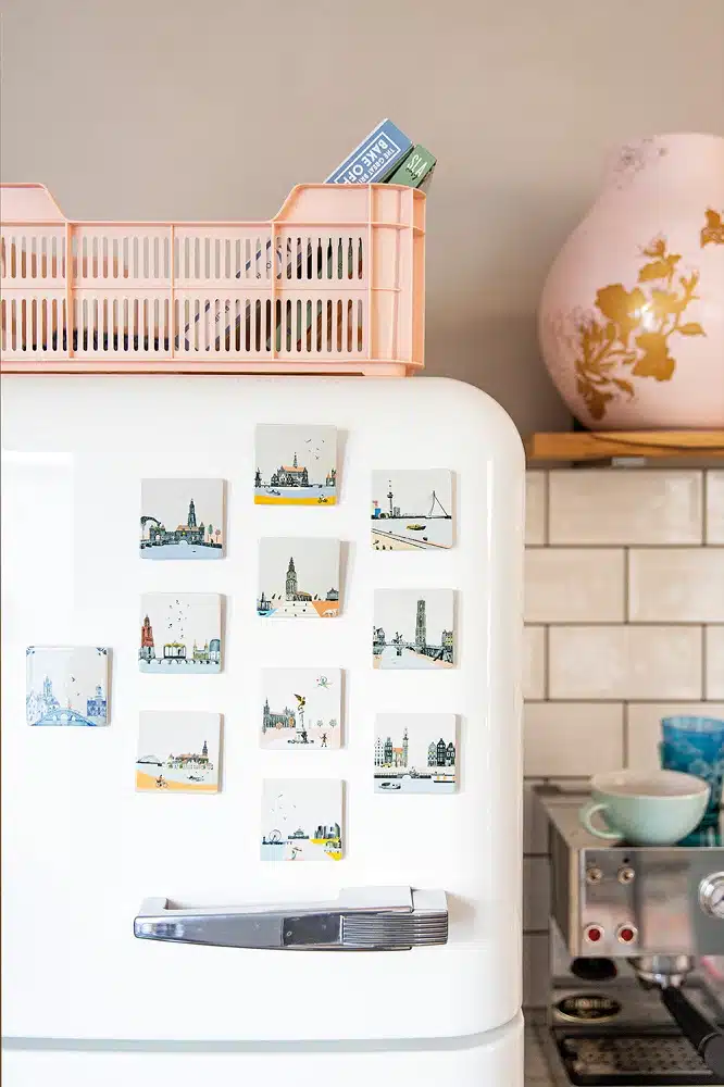 De mini tegels van Storytiles hebben een magneet op de achterkant en komen met een klein ophangstickertje. Je kunt kiezen of je de mini als magneet wil gebruiken of aan de muur wil hangen.