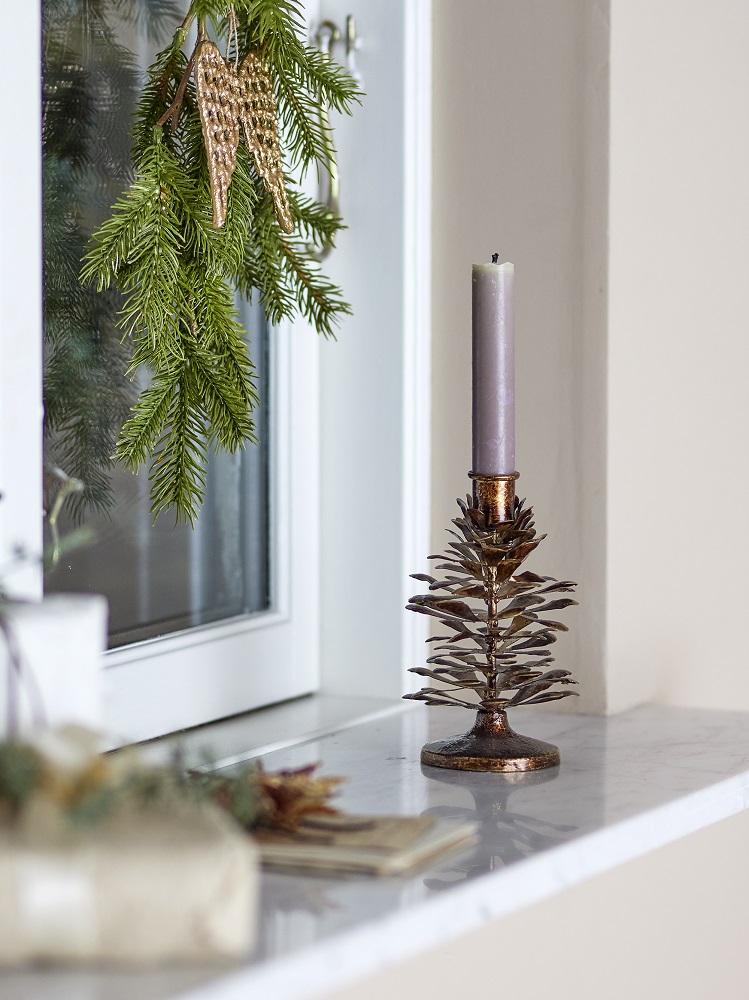 De Mirabel kandelaar van Bloomingville is een elegante en gedetailleerde kandelaar van metaal met een elegante gouden afwerking. Het ontwerp is geinspireerd op een dennenappel, waarbij de fijne details in de vorm en structuur worden benadrukt. Ideaal als decoratie op de kersttafel of op de vensterbank. Deze kandelaar voegt warmte en sfeer toe aan je interieur!