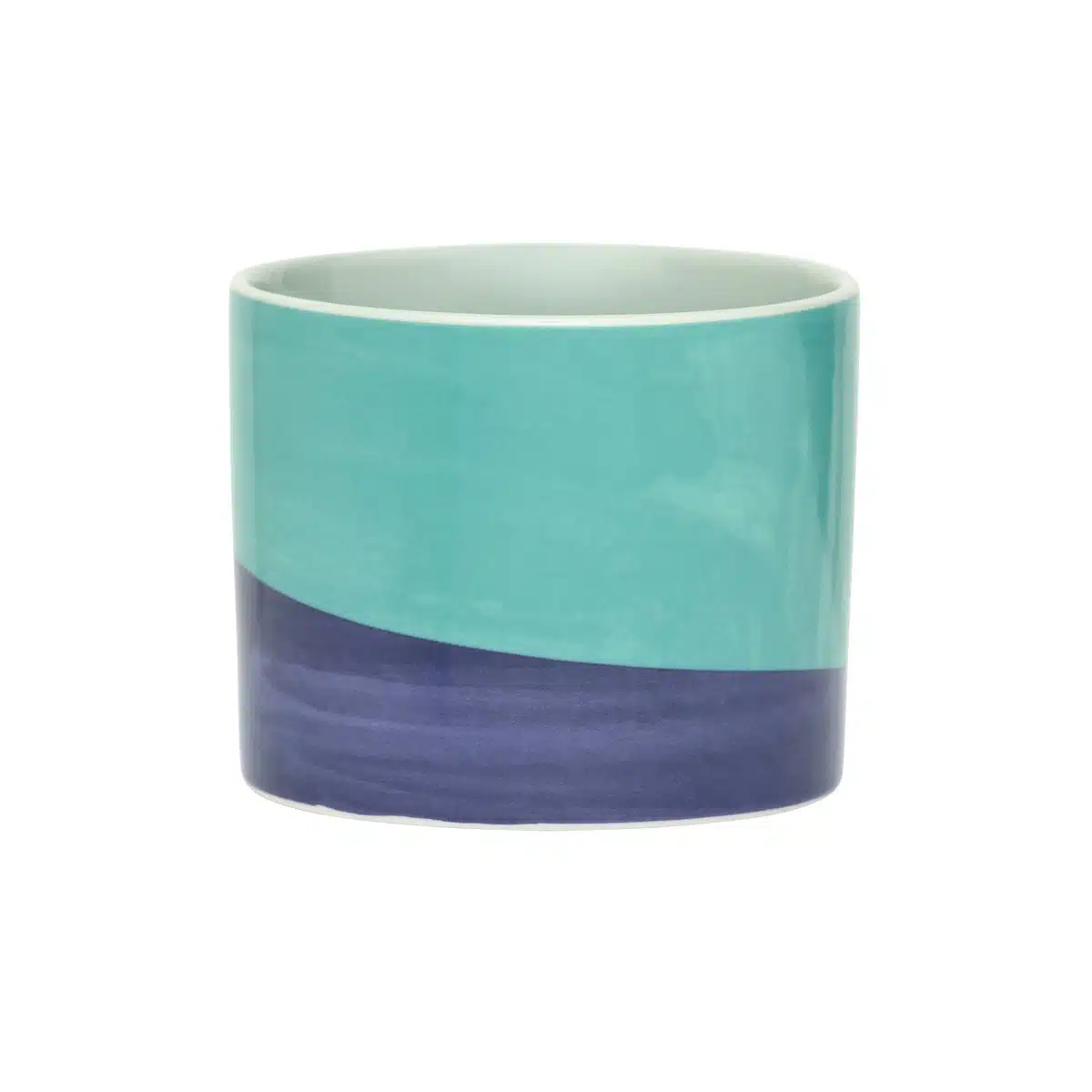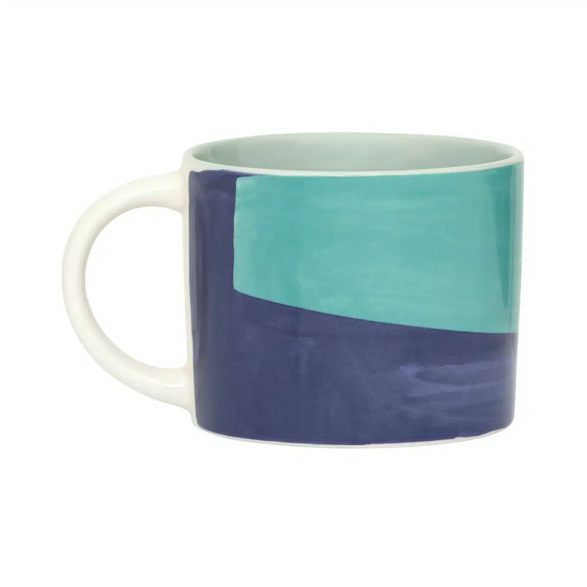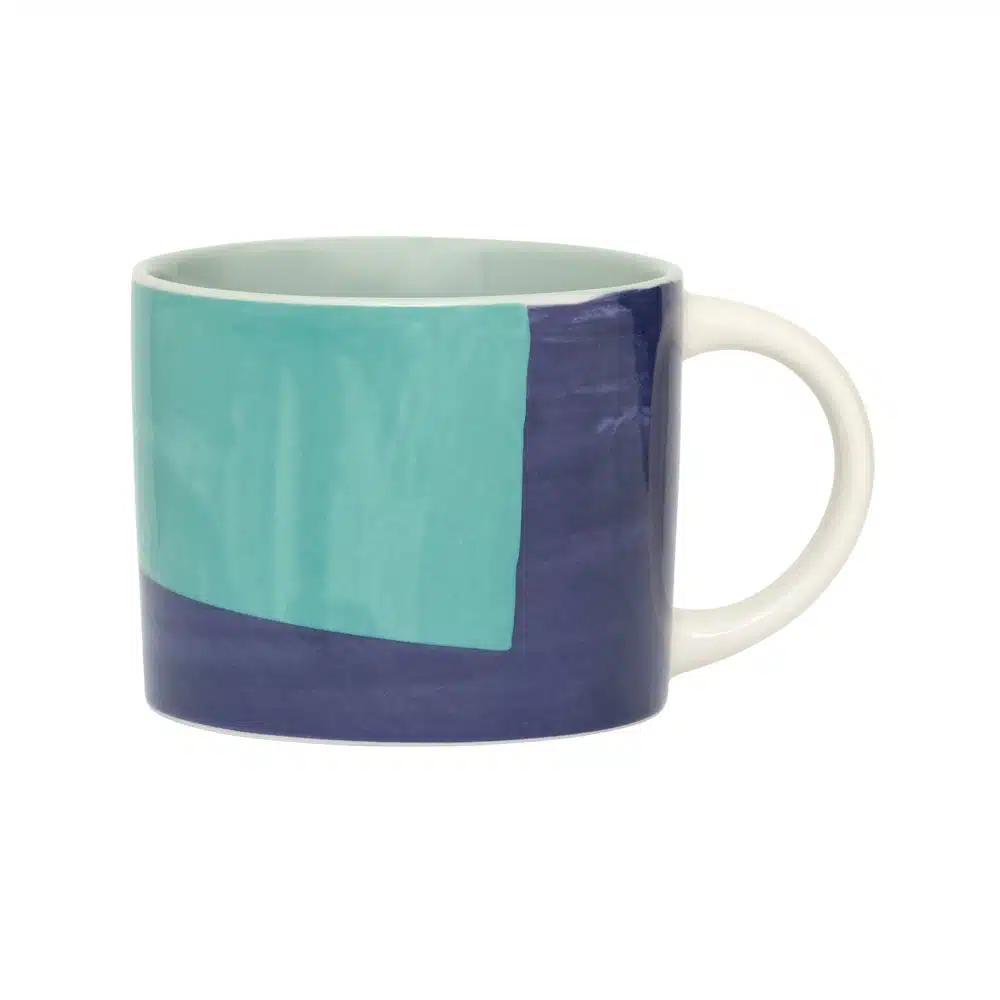 Deze grote mok heeft een handgeschilderd ontwerp in rijke tinten van diep blauwpaars en azuurblauw, afgewerkt met een zachte groene binnenkant. De gedurfde kleurblokken en de gladde, glanzende afwerking geven het een hedendaagse maar ambachtelijke uitstraling, waardoor het een perfecte keuze is om je te verwarmen met een warme drank op een koude avond of een vroege ochtend.