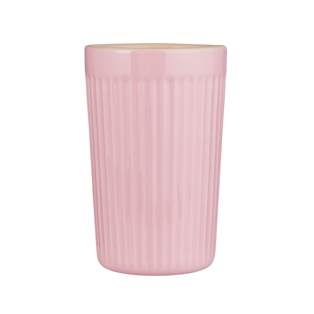 Een leuke grote mok zonder oor (melkbeker) in een zachte roze tint – green tea.