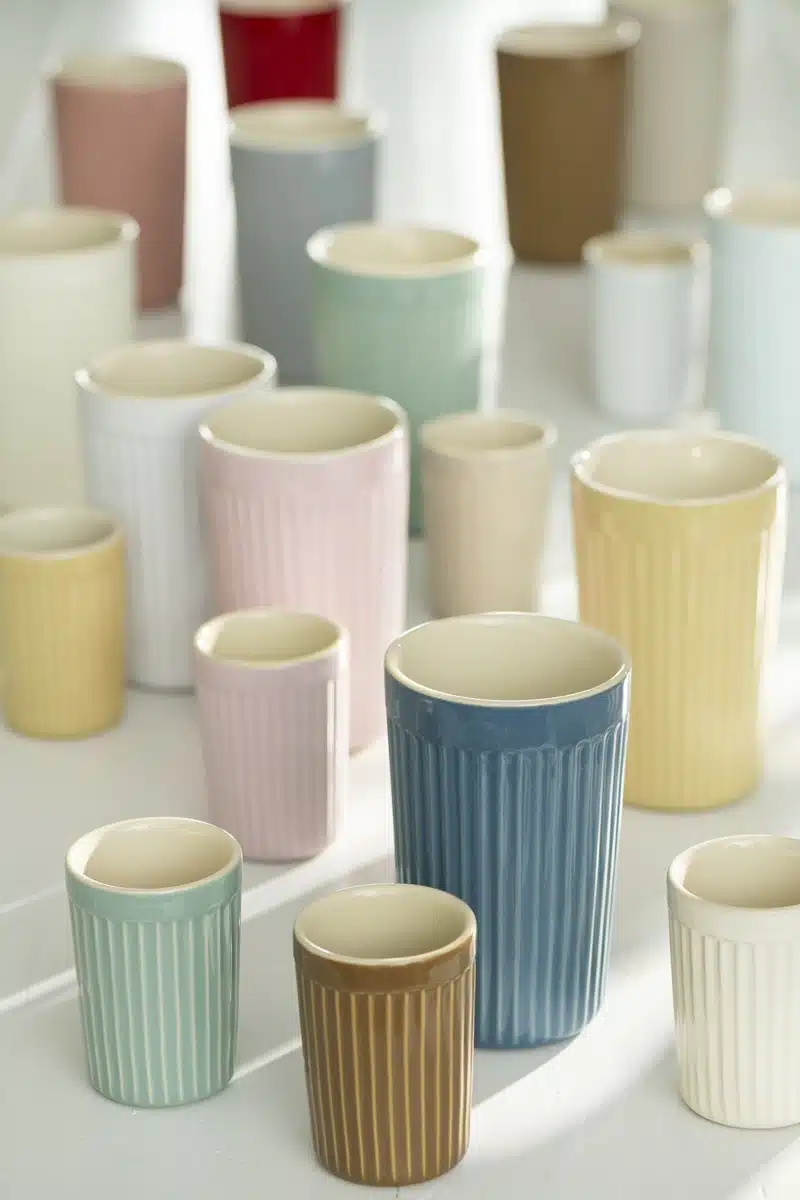 Een leuke grote mok zonder oor (melkbeker) in een zachte groene tint – green tea.
