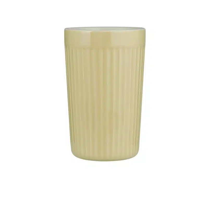 Een leuke grote mok zonder oor (melkbeker) in een zachte kleur geel (strogeel).