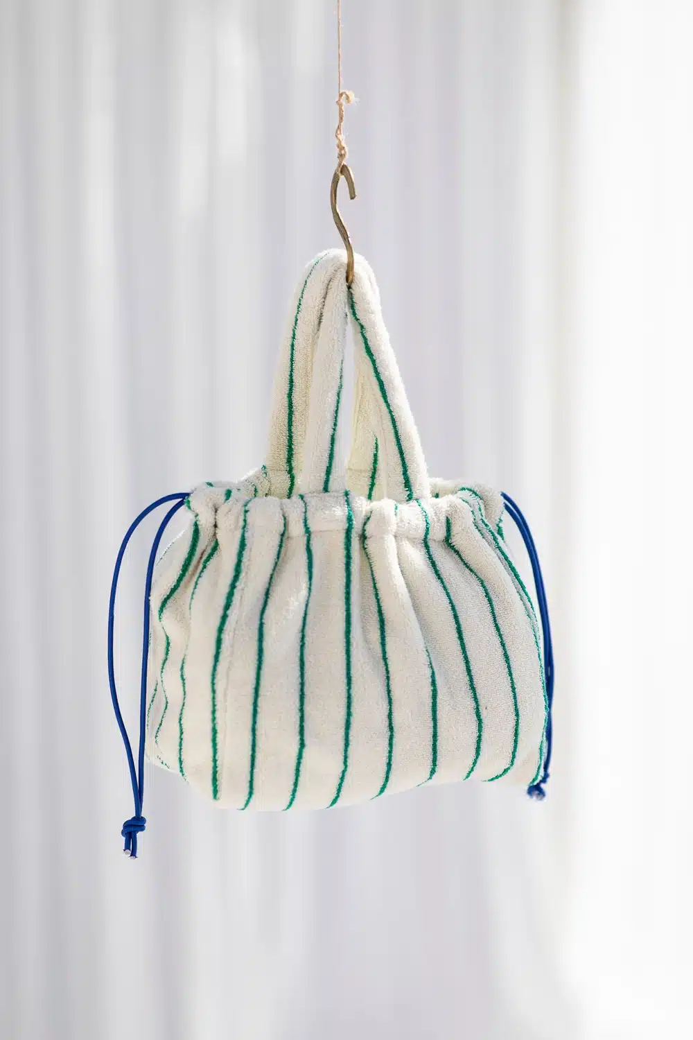 De Naram Handbag heeft een kort handvat en een open, gerimpelde bovenzijde met gekleurde elastische trekkoorden, zodat de tas moeiteloos kan worden gesloten door simpelweg aan de koorden te trekken – dit zorgt voor een charmant gerimpeld sluitingseffect. De elastische koorden zijn in een betoverende tint blauw.