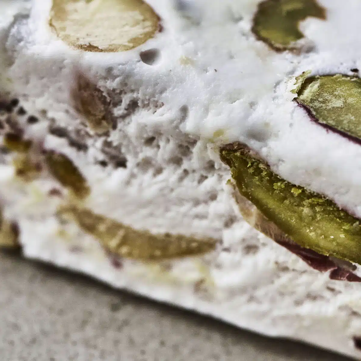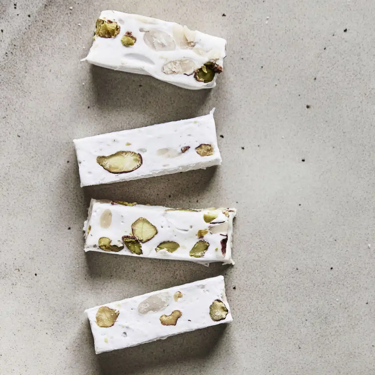 Ingrediënten: suiker, glucosestroop, geblancheerde amandelen 23%, pistachenoten 10%, honing, glucose-fructosestroop, wafels (aardappelzetmeel, water, zonnebloemolie), egg white poeder, natuurlijk citroenaroma, maïszetmeel.