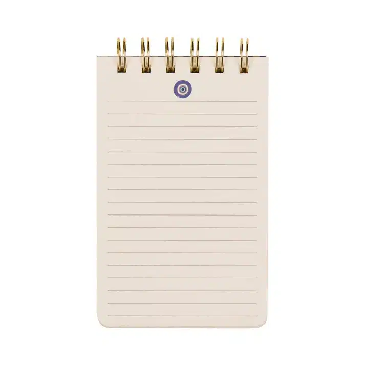 Notitieblok van 15x9cm • 80 gelinieerde vellen • Gouden dubbele draadbinding • Bedrukt met soja-inkt op 100 gsm ongecoat houtvrij, zuurvrij papier