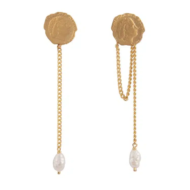 De Ten Cent Chain Pearl Stud Earring is een asymmetrisch paar stud oorbellen met een oud-hollands dubbeltje met daaraan een stukje chain en aan een kant een pareltje. Het ‘Ten Cent’ muntje van deze elegante oorbellen heeft een diameter van ca 1 cm.