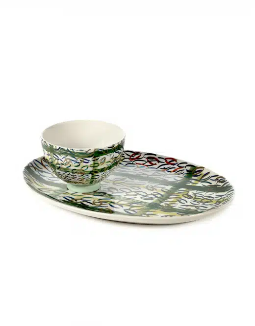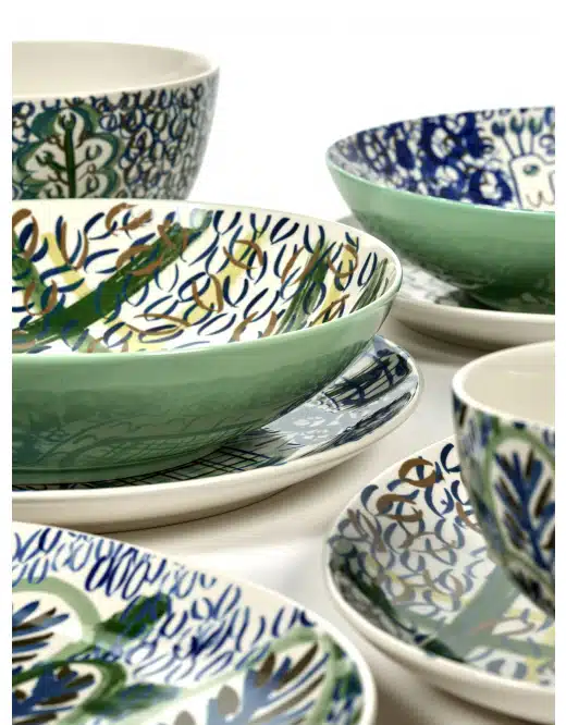 Bela Silva is een echte wereldburger en verwerkt vaak impressies uit andere culturen in haar keramiek. Ze heeft de nieuwe schalen en kommen Japanse Kimono’s genoemd omdat de patronen en kleuren haar aan Japan doen denken. Het is een bijzonder optimistische serie, een ode aan de zomer, aan picknicks op het gras, aan bloemen en blauwe luchten.