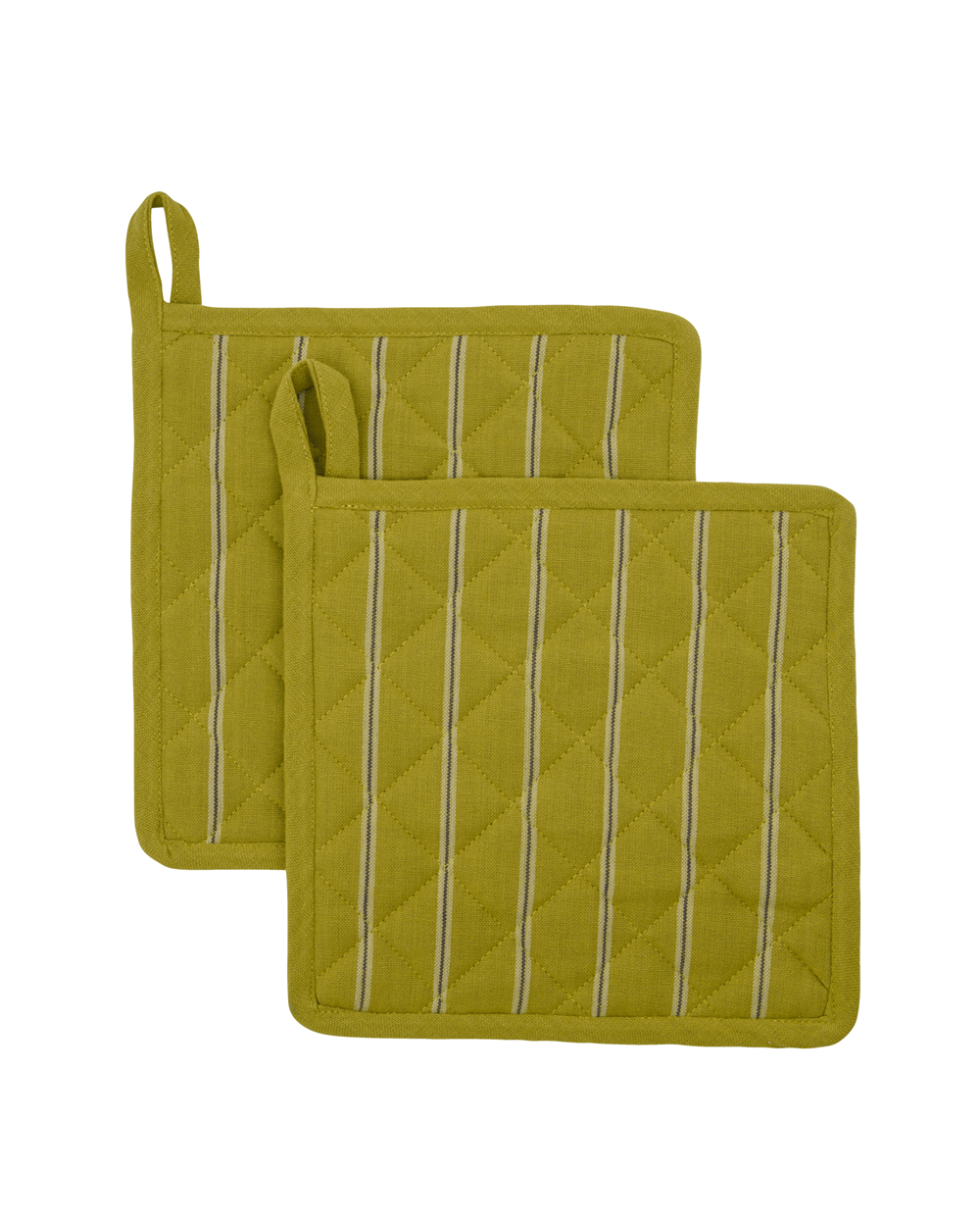 Voeg kleur toe aan jouw keuken met deze set van 2 mosterdkleurige pannenlappen. De opvallende mosterdkleurige basis wordt prachtig aangevuld door smalle strepen in off-white en zwart, wat zorgt voor een klassiek en veelzijdig design.