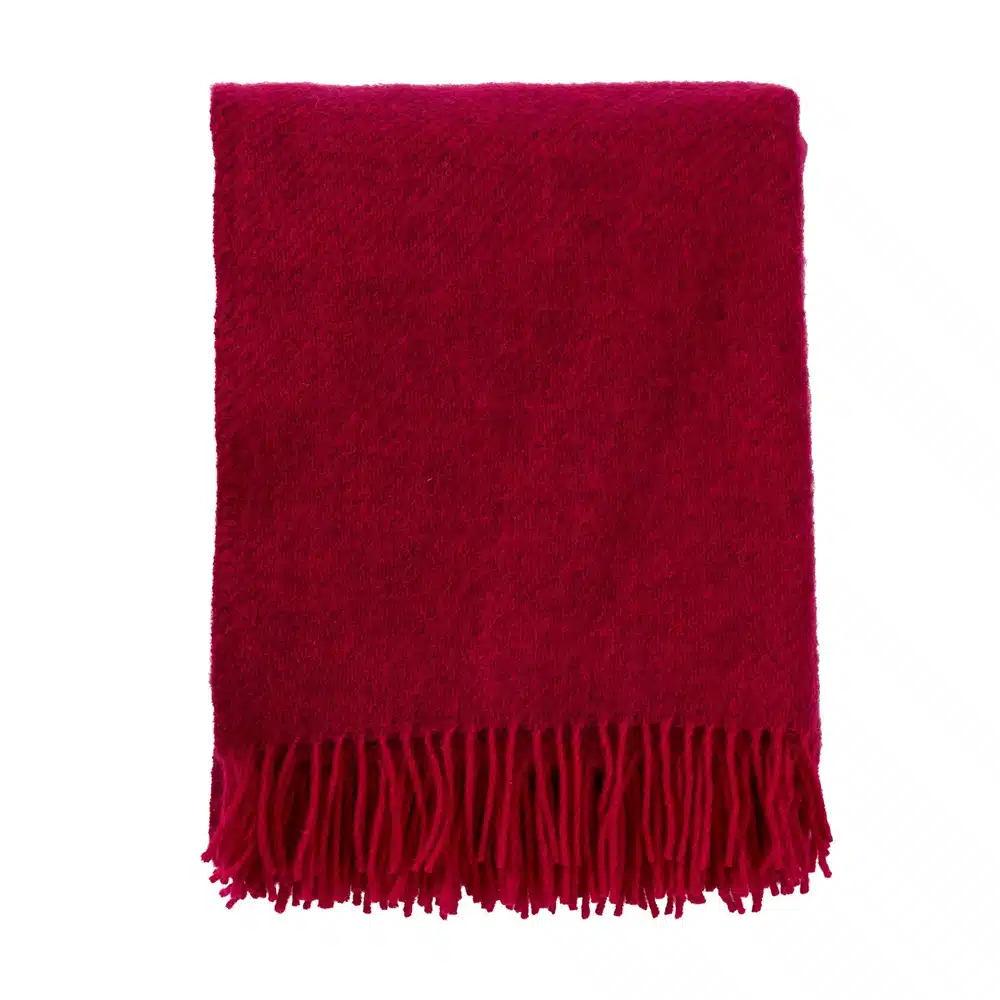 Laat je omringen door zachtheid en verfijning met het Klippan plaid in een donker cerise (roze/fuchsia – 3e van onder op stapel) kleur. Dit prachtige plaid is geweven uit 100% pure lamswol en voelt luchtig, warm en comfortabel aan, perfect voor elk seizoen.